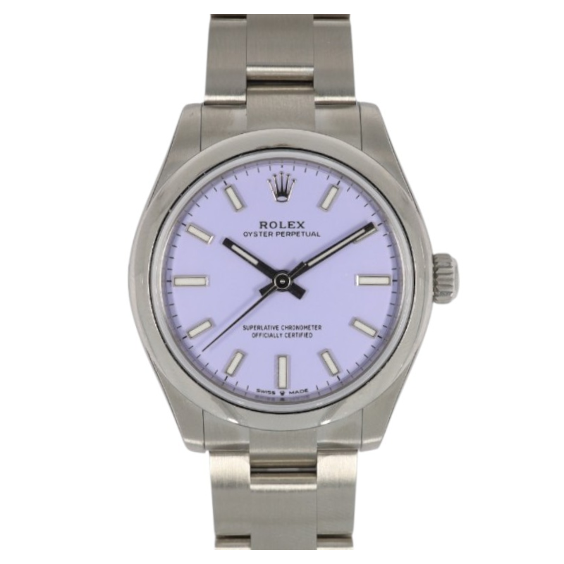 This Rolex Oyster Perpetual 277200 has a lavender dial and a bracelet strap. This Rolex has undergone a thorough inspection of water resistance, accuracy, functionality and condition to determine the level of reconditioning required to meet our strict standards. It has also been referenced against technical documents and manufacturer records where available to ensure authenticity and a clean history. Our watches have a 24-month warranty for your peace of mind, in conjunction with any remaining manufacturer’s warranty from new or from service. To maintain the manufacturer’s warranty on this watch, it has not been polished in our service centre.