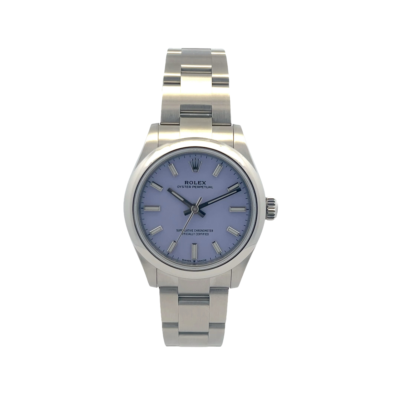 This Rolex Oyster Perpetual 277200 has a lavender dial and a bracelet strap. This Rolex has undergone a thorough inspection of water resistance, accuracy, functionality and condition to determine the level of reconditioning required to meet our strict standards. It has also been referenced against technical documents and manufacturer records where available to ensure authenticity and a clean history. Our watches have a 24-month warranty for your peace of mind, in conjunction with any remaining manufacturer’s warranty from new or from service. To maintain the manufacturer’s warranty on this watch, it has not been polished in our service centre.