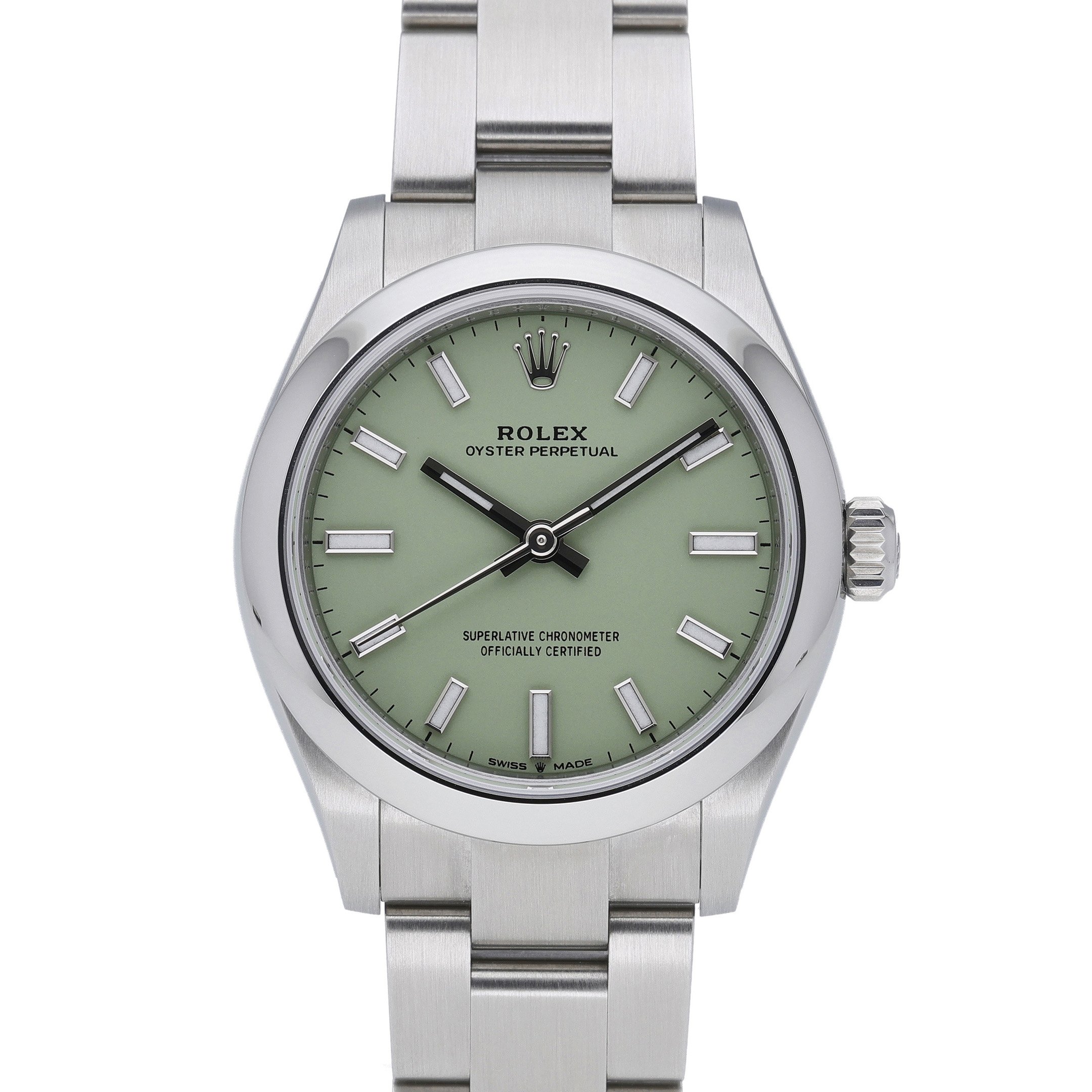 This Rolex Oyster Perpetual 277200 has a pistachio dial and a bracelet strap. This Rolex has undergone a thorough inspection of water resistance, accuracy, functionality and condition to determine the level of reconditioning required to meet our strict standards. It has also been referenced against technical documents and manufacturer records where available to ensure authenticity and a clean history. Our watches have a 24-month warranty for your peace of mind, in conjunction with any remaining manufacturer’s warranty from new or from service. To maintain the manufacturer’s warranty on this watch, it has not been polished in our service centre.