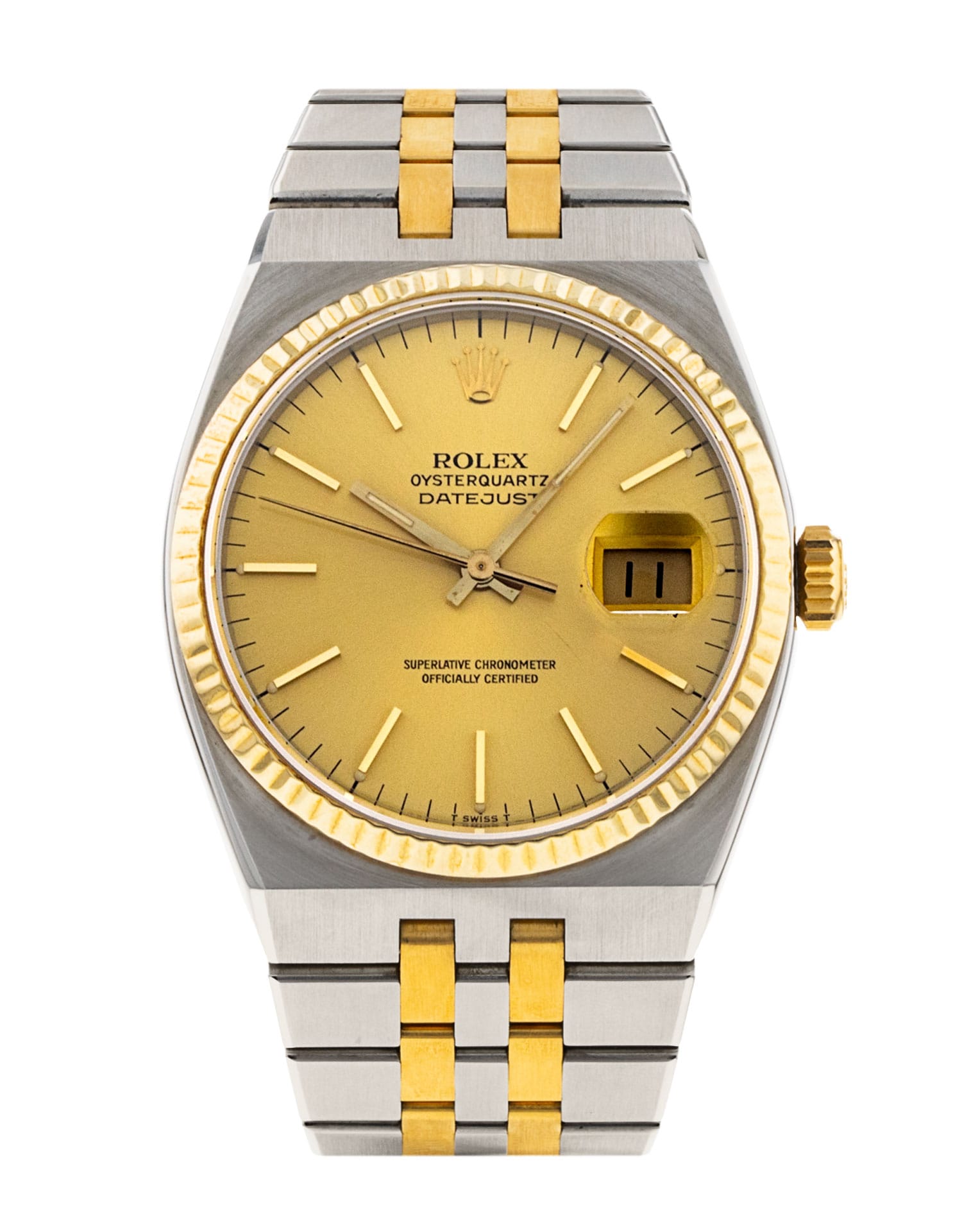 This Rolex Oysterquartz Datejust 17013 has a champagne baton dial and a bracelet strap. This Rolex has undergone a thorough inspection of water resistance, accuracy, functionality and condition to determine the level of reconditioning required to meet our strict standards. It has also been referenced against technical documents and manufacturer records where available to ensure authenticity and a clean history. All our watches have a 24-month warranty for your peace of mind. One of our skilled polishing technicians has removed marks on the case and bracelet of this watch, brought about by daily wear and tear, which is why this watch does not come with the remaining manufacturer’s warranty.