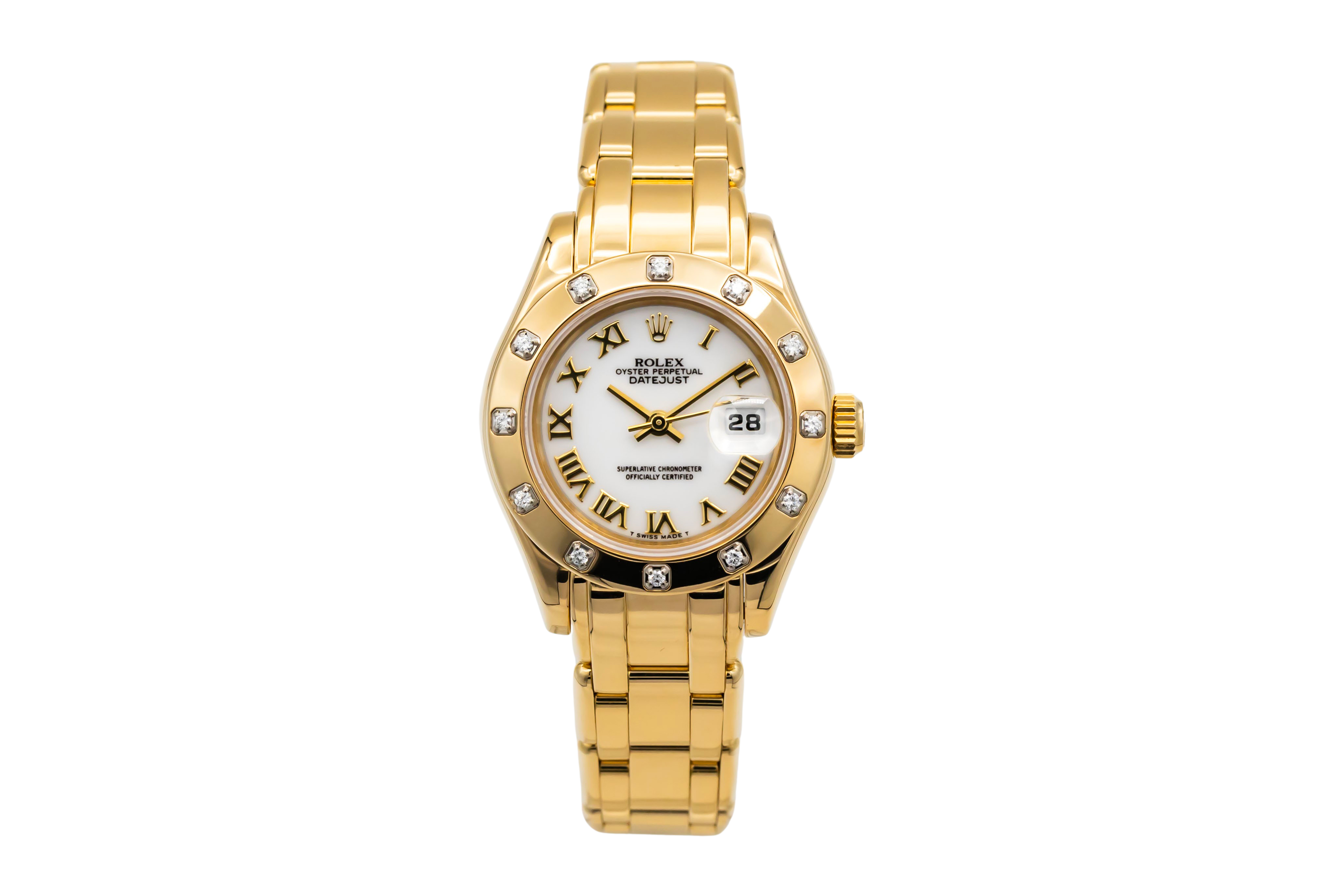 This Rolex Pearlmaster 69318 has a white roman numeral dial and a bracelet strap. This Rolex has undergone a thorough inspection of water resistance, accuracy, functionality and condition to determine the level of reconditioning required to meet our strict standards. It has also been referenced against technical documents and manufacturer records where available to ensure authenticity and a clean history. All our watches have a 24-month warranty for your peace of mind. One of our skilled polishing technicians has removed marks on the case and bracelet of this watch, brought about by daily wear and tear, which is why this watch does not come with the remaining manufacturer’s warranty.