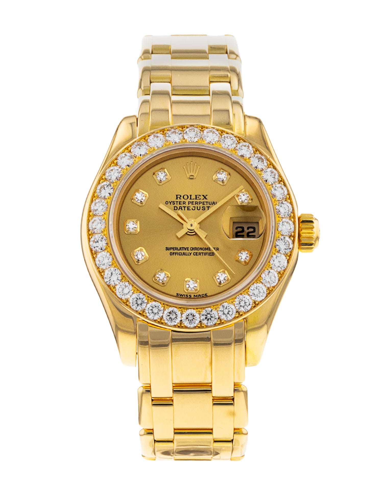 This Rolex Pearlmaster 80298 has a champagne diamond dial and a bracelet strap. This Rolex has undergone a thorough inspection of water resistance, accuracy, functionality and condition to determine the level of reconditioning required to meet our strict standards. It has also been referenced against technical documents and manufacturer records where available to ensure authenticity and a clean history. All our watches have a 24-month warranty for your peace of mind. One of our skilled polishing technicians has removed marks on the case and bracelet of this watch, brought about by daily wear and tear, which is why this watch does not come with the remaining manufacturer’s warranty.