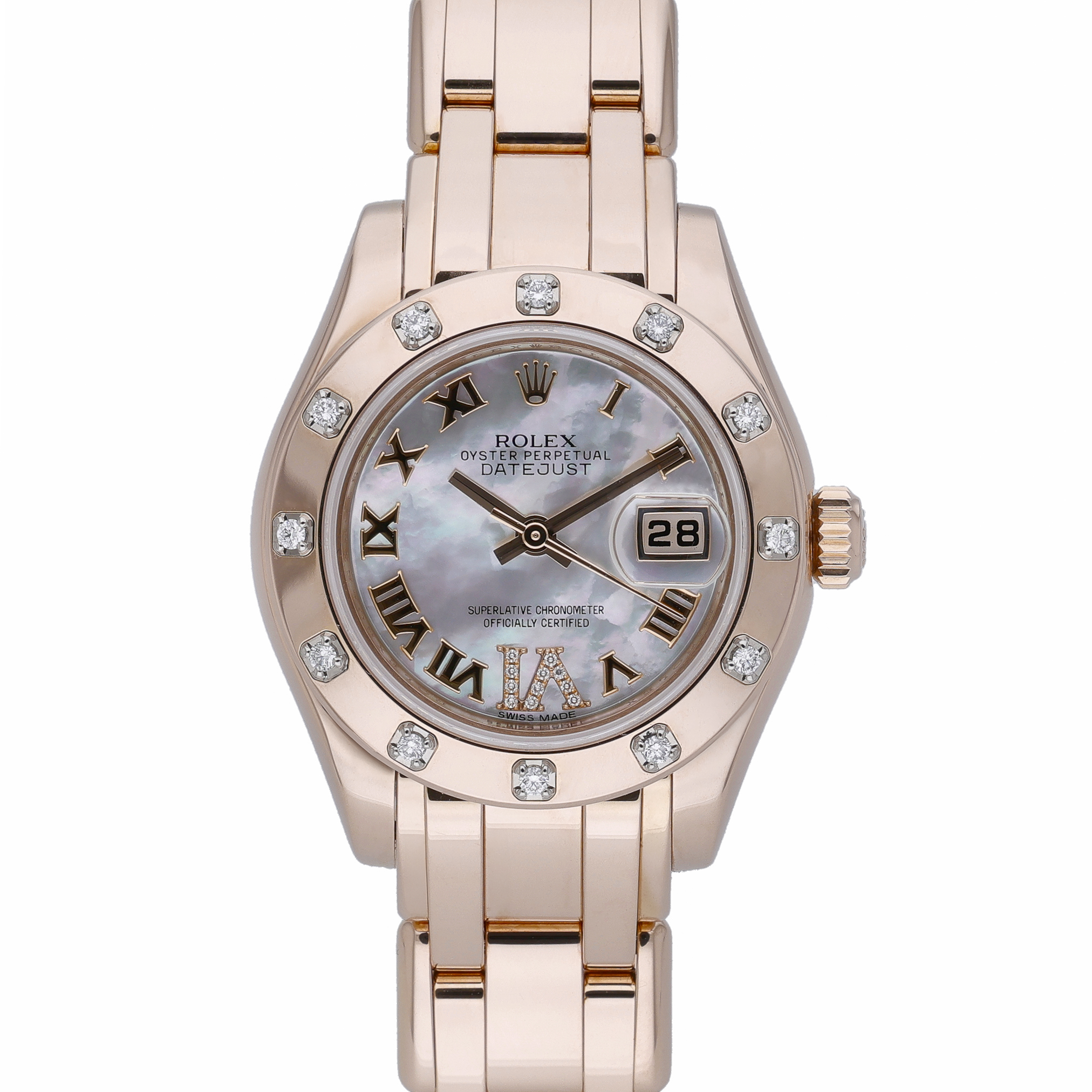 This Rolex Pearlmaster 80315 has a mother of pearl white roman numeral diamond dial and a bracelet strap. This Rolex has undergone a thorough inspection of water resistance, accuracy, functionality and condition to determine the level of reconditioning required to meet our strict standards. It has also been referenced against technical documents and manufacturer records where available to ensure authenticity and a clean history. All our watches have a 24-month warranty for your peace of mind. One of our skilled polishing technicians has removed marks on the case and bracelet of this watch, brought about by daily wear and tear, which is why this watch does not come with the remaining manufacturer’s warranty.