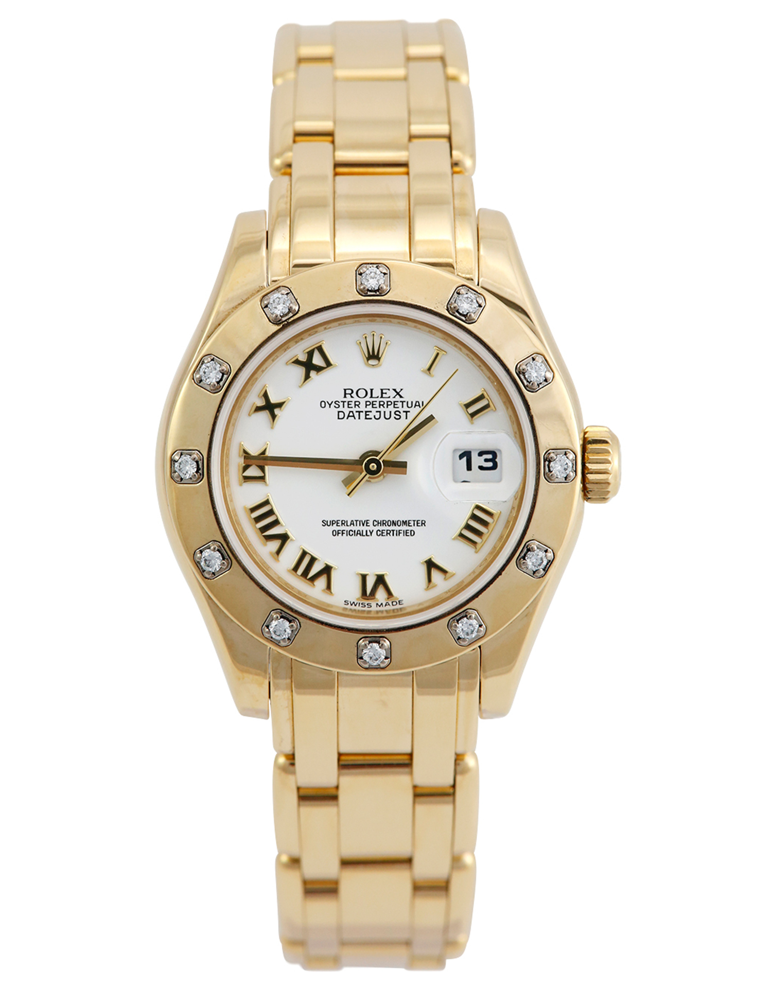 This Rolex Pearlmaster 80318 has a white roman numeral dial and a bracelet strap. This Rolex has undergone a thorough inspection of water resistance, accuracy, functionality and condition to determine the level of reconditioning required to meet our strict standards. It has also been referenced against technical documents and manufacturer records where available to ensure authenticity and a clean history. All our watches have a 24-month warranty for your peace of mind. One of our skilled polishing technicians has removed marks on the case and bracelet of this watch, brought about by daily wear and tear, which is why this watch does not come with the remaining manufacturer’s warranty.