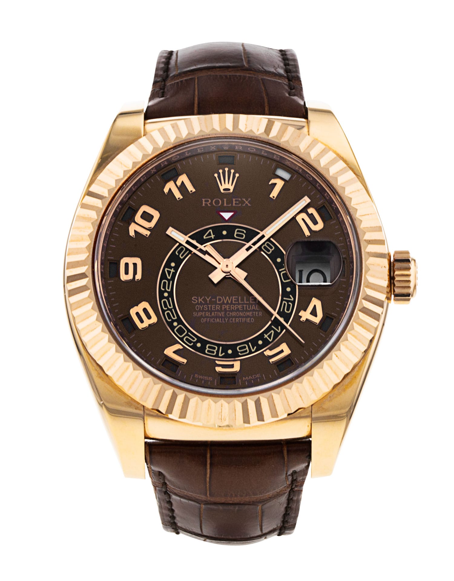 This Rolex Sky-Dweller 326135 has a chocolate arabic dial and a leather strap. This Rolex has undergone a thorough inspection of water resistance, accuracy, functionality and condition to determine the level of reconditioning required to meet our strict standards. It has also been referenced against technical documents and manufacturer records where available to ensure authenticity and a clean history. All our watches have a 24-month warranty for your peace of mind. One of our skilled polishing technicians has removed marks on the case and bracelet of this watch, brought about by daily wear and tear, which is why this watch does not come with the remaining manufacturer’s warranty.
