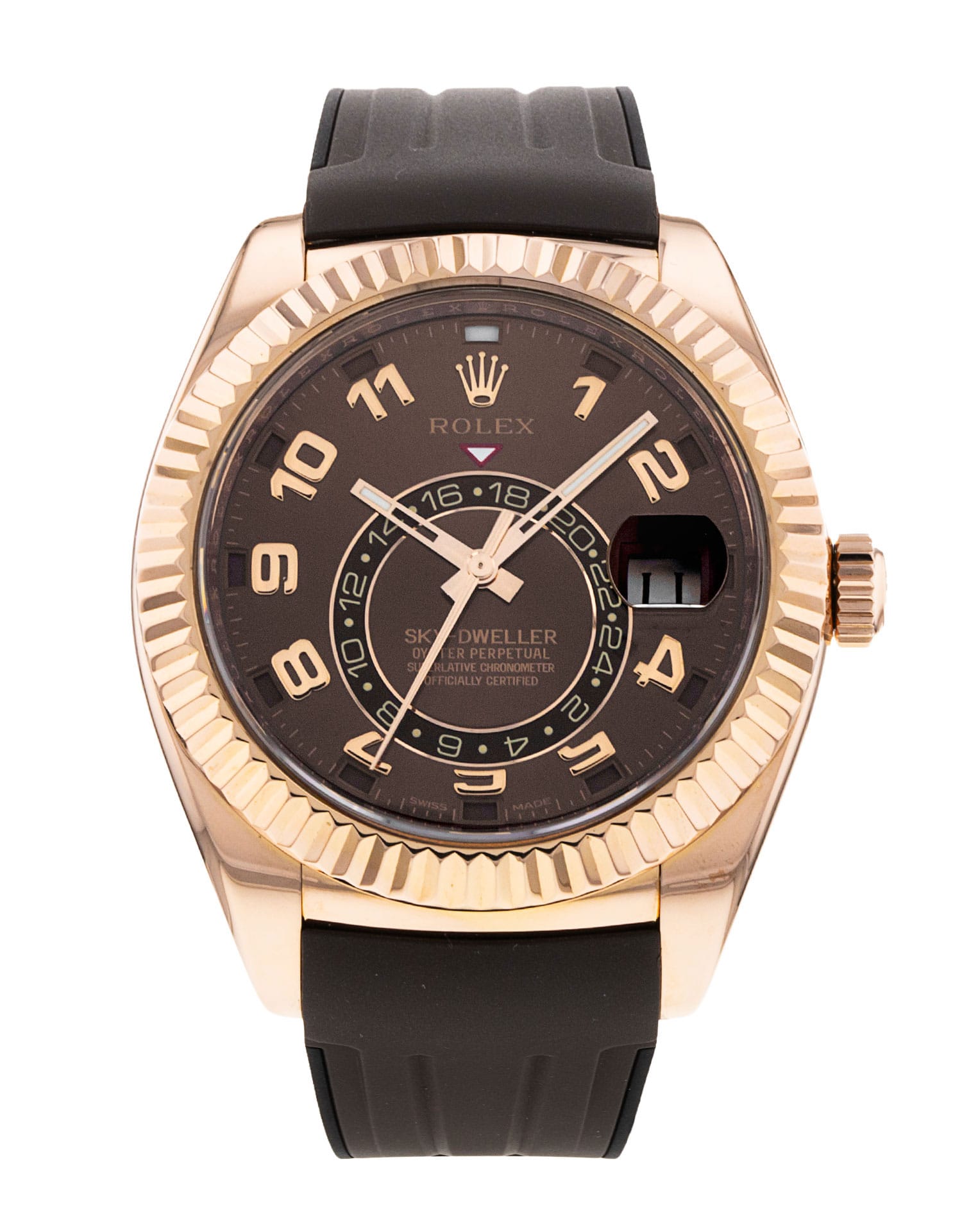 This Rolex Sky-Dweller 326135 has a chocolate arabic dial and a rubber strap. This Rolex has undergone a thorough inspection of water resistance, accuracy, functionality and condition to determine the level of reconditioning required to meet our strict standards. It has also been referenced against technical documents and manufacturer records where available to ensure authenticity and a clean history. All our watches have a 24-month warranty for your peace of mind. One of our skilled polishing technicians has removed marks on the case and bracelet of this watch, brought about by daily wear and tear, which is why this watch does not come with the remaining manufacturer’s warranty.