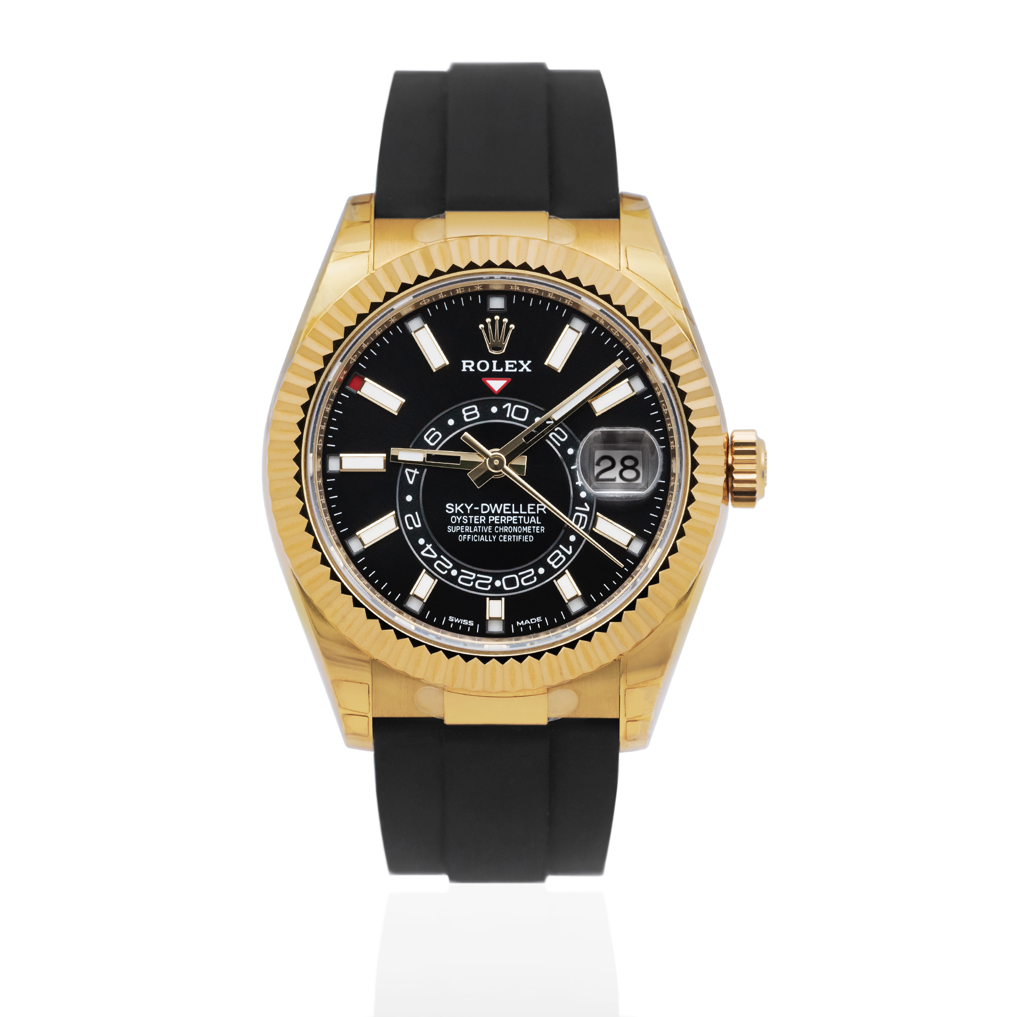 This Rolex Sky-Dweller 326238 has a black baton dial and a rubber strap. This Rolex has undergone a thorough inspection of water resistance, accuracy, functionality and condition to determine the level of reconditioning required to meet our strict standards. It has also been referenced against technical documents and manufacturer records where available to ensure authenticity and a clean history. Our watches have a 24-month warranty for your peace of mind, in conjunction with any remaining manufacturer’s warranty from new or from service. To maintain the manufacturer’s warranty on this watch, it has not been polished in our service centre.