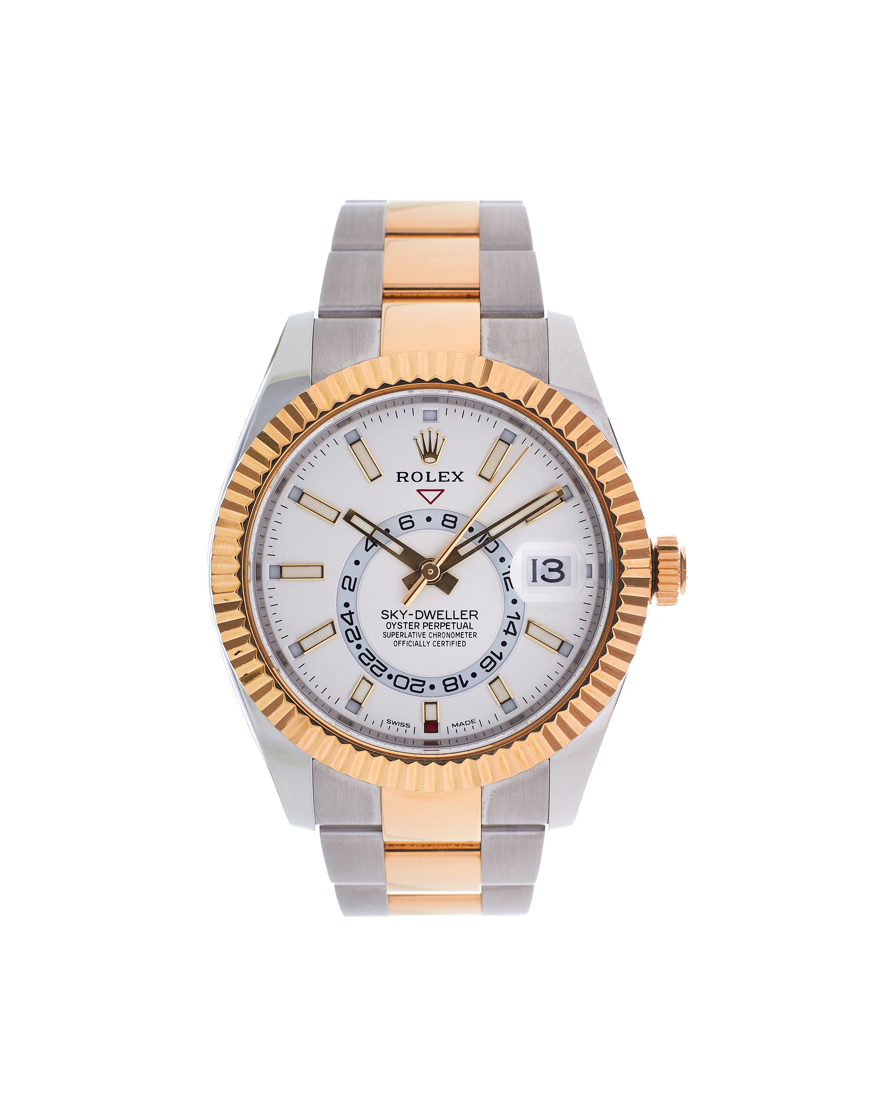 This Rolex Sky-Dweller 326933 has a white baton dial and a bracelet strap. This Rolex has undergone a thorough inspection of water resistance, accuracy, functionality and condition to determine the level of reconditioning required to meet our strict standards. It has also been referenced against technical documents and manufacturer records where available to ensure authenticity and a clean history. All our watches have a 24-month warranty for your peace of mind. One of our skilled polishing technicians has removed marks on the case and bracelet of this watch, brought about by daily wear and tear, which is why this watch does not come with the remaining manufacturer’s warranty.