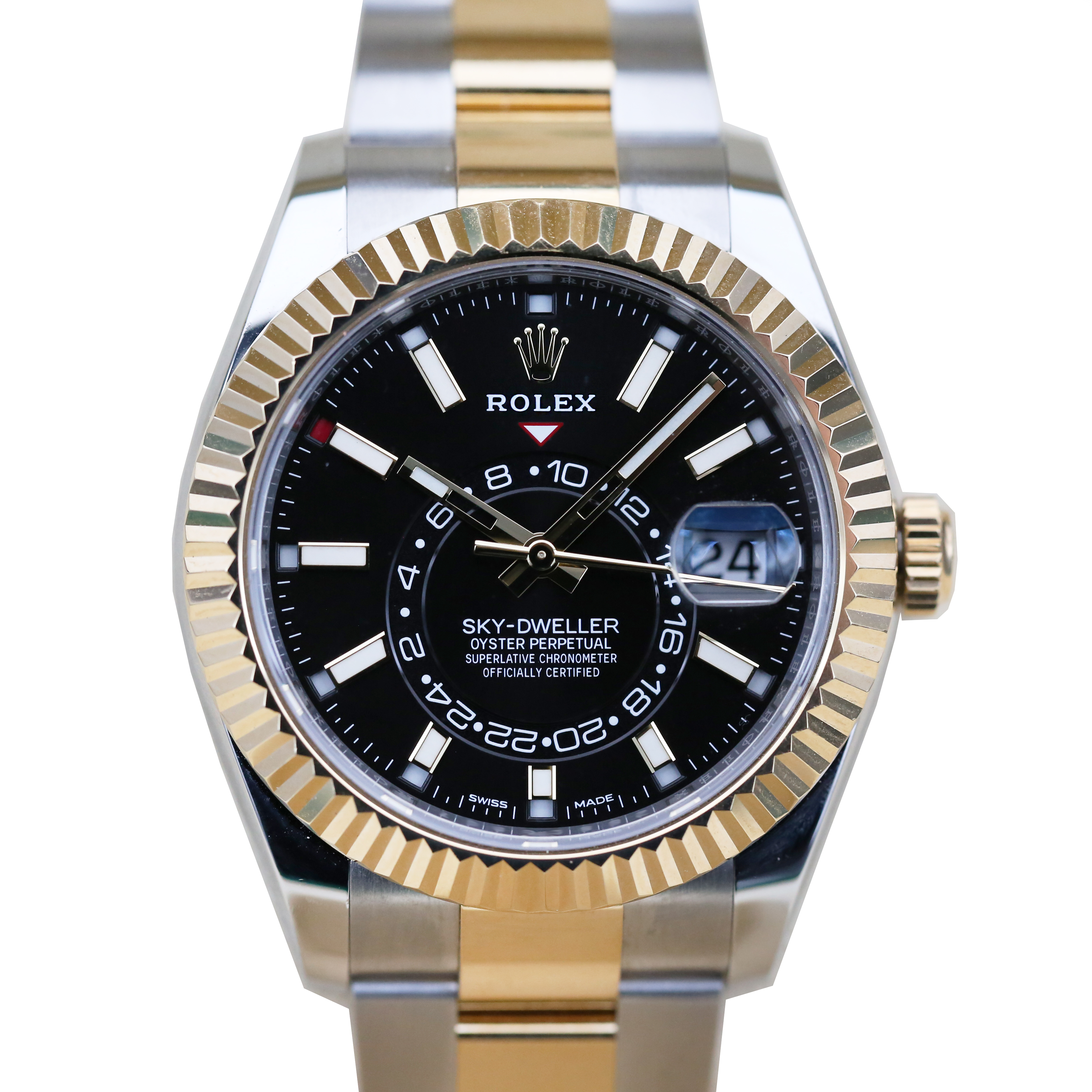 This Rolex Sky-Dweller 326933 has a black baton dial and a bracelet strap. This Rolex has undergone a thorough inspection of water resistance, accuracy, functionality and condition to determine the level of reconditioning required to meet our strict standards. It has also been referenced against technical documents and manufacturer records where available to ensure authenticity and a clean history. All our watches have a 24-month warranty for your peace of mind. One of our skilled polishing technicians has removed marks on the case and bracelet of this watch, brought about by daily wear and tear, which is why this watch does not come with the remaining manufacturer’s warranty.