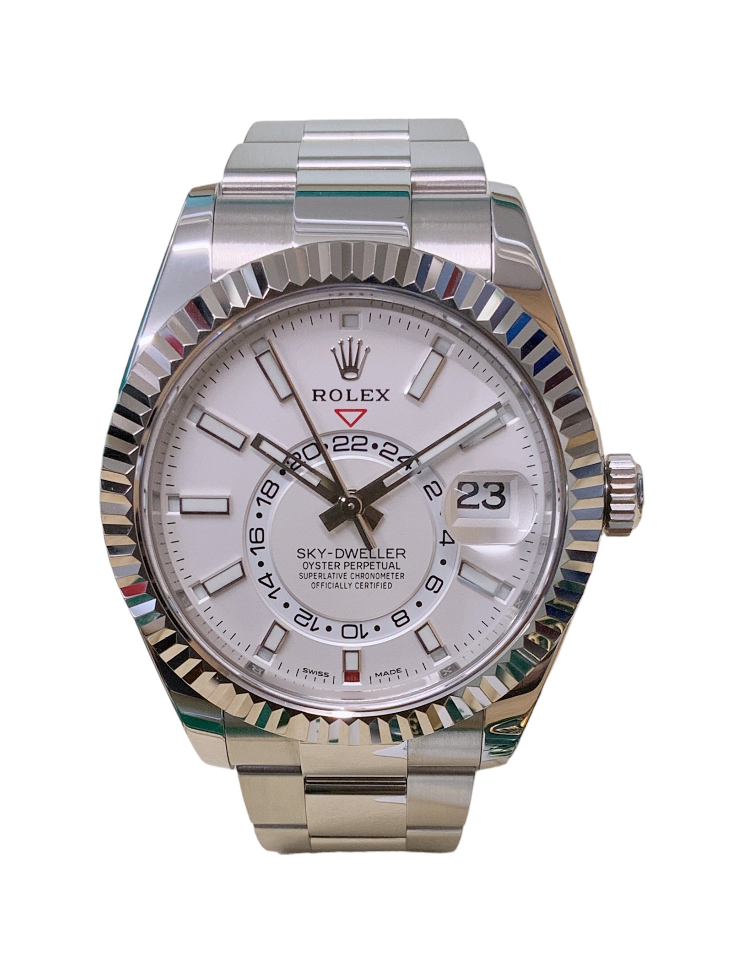 This Rolex Sky-Dweller 326934 has a white baton dial and a bracelet strap. This Rolex has undergone a thorough inspection of water resistance, accuracy, functionality and condition to determine the level of reconditioning required to meet our strict standards. It has also been referenced against technical documents and manufacturer records where available to ensure authenticity and a clean history. All our watches have a 24-month warranty for your peace of mind. One of our skilled polishing technicians has removed marks on the case and bracelet of this watch, brought about by daily wear and tear, which is why this watch does not come with the remaining manufacturer’s warranty.