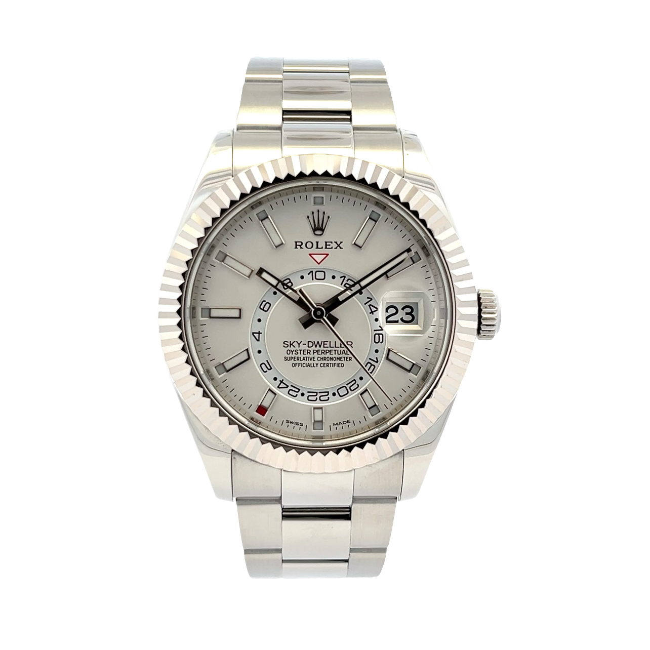 This Rolex Sky-Dweller 326934 has a white baton dial and a bracelet strap. This Rolex has undergone a thorough inspection of water resistance, accuracy, functionality and condition to determine the level of reconditioning required to meet our strict standards. It has also been referenced against technical documents and manufacturer records where available to ensure authenticity and a clean history. All our watches have a 24-month warranty for your peace of mind. One of our skilled polishing technicians has removed marks on the case and bracelet of this watch, brought about by daily wear and tear, which is why this watch does not come with the remaining manufacturer’s warranty.