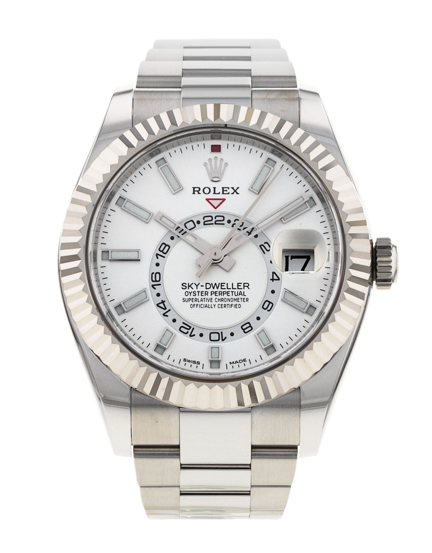 This Rolex Sky-Dweller 326934 has a white baton dial and a bracelet strap. This Rolex has undergone a thorough inspection of water resistance, accuracy, functionality and condition to determine the level of reconditioning required to meet our strict standards. It has also been referenced against technical documents and manufacturer records where available to ensure authenticity and a clean history. All our watches have a 24-month warranty for your peace of mind. One of our skilled polishing technicians has removed marks on the case and bracelet of this watch, brought about by daily wear and tear, which is why this watch does not come with the remaining manufacturer’s warranty.
