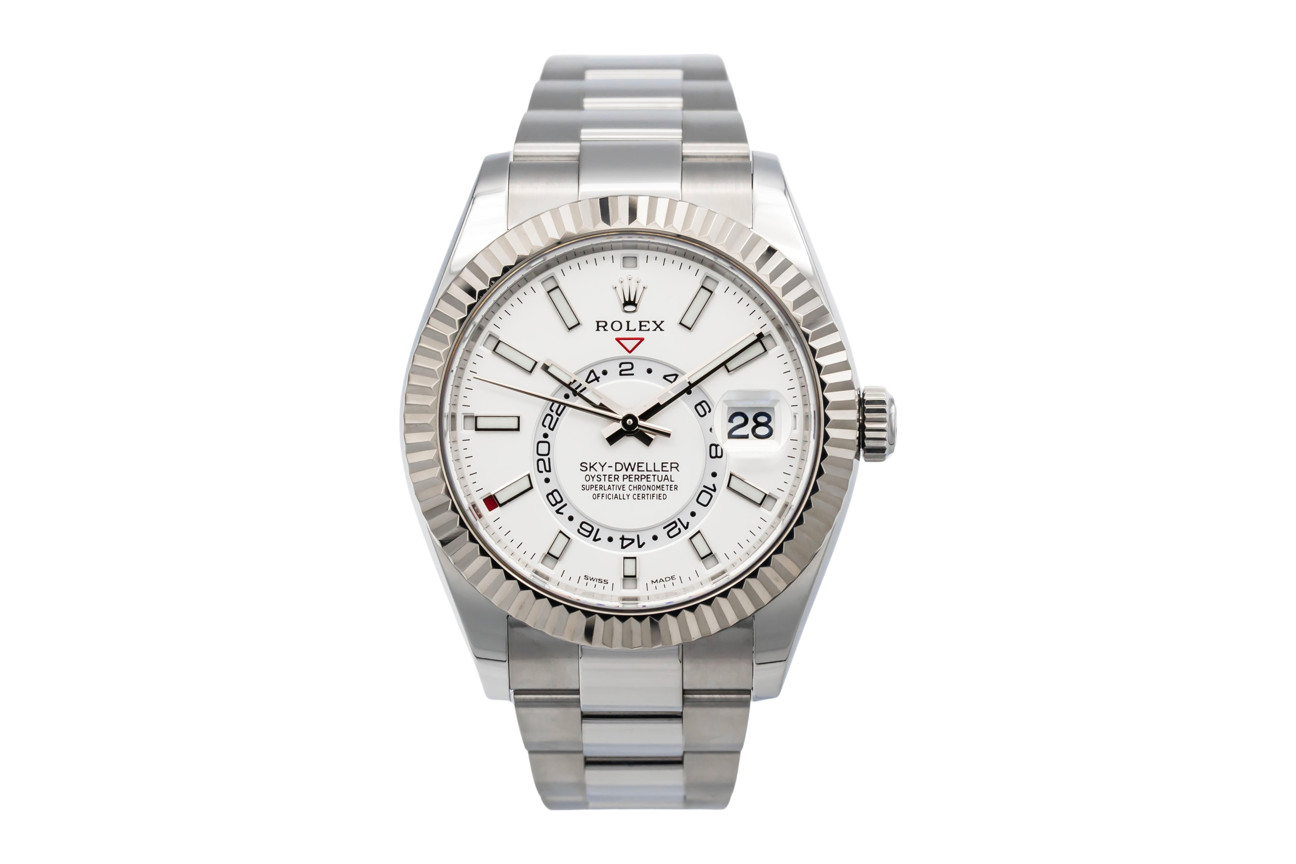 This Rolex Sky-Dweller 326934 has a white baton dial and a bracelet strap. This Rolex has undergone a thorough inspection of water resistance, accuracy, functionality and condition to determine the level of reconditioning required to meet our strict standards. It has also been referenced against technical documents and manufacturer records where available to ensure authenticity and a clean history. Our watches have a 24-month warranty for your peace of mind, in conjunction with any remaining manufacturer’s warranty from new or from service. To maintain the manufacturer’s warranty on this watch, it has not been polished in our service centre.