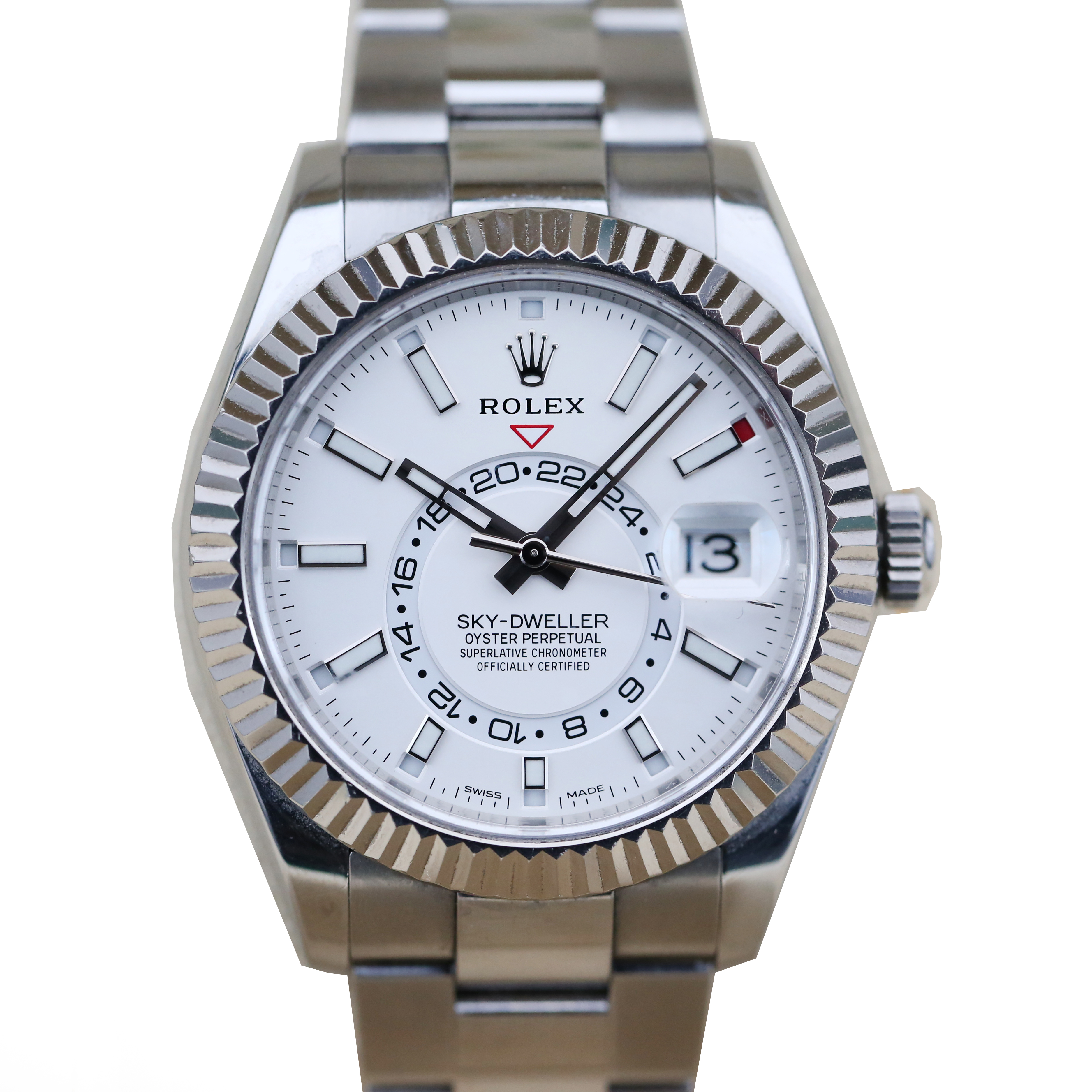 This Rolex Sky-Dweller 326934 has a white baton dial and a bracelet strap. This Rolex has undergone a thorough inspection of water resistance, accuracy, functionality and condition to determine the level of reconditioning required to meet our strict standards. It has also been referenced against technical documents and manufacturer records where available to ensure authenticity and a clean history. All our watches have a 24-month warranty for your peace of mind. One of our skilled polishing technicians has removed marks on the case and bracelet of this watch, brought about by daily wear and tear, which is why this watch does not come with the remaining manufacturer’s warranty.