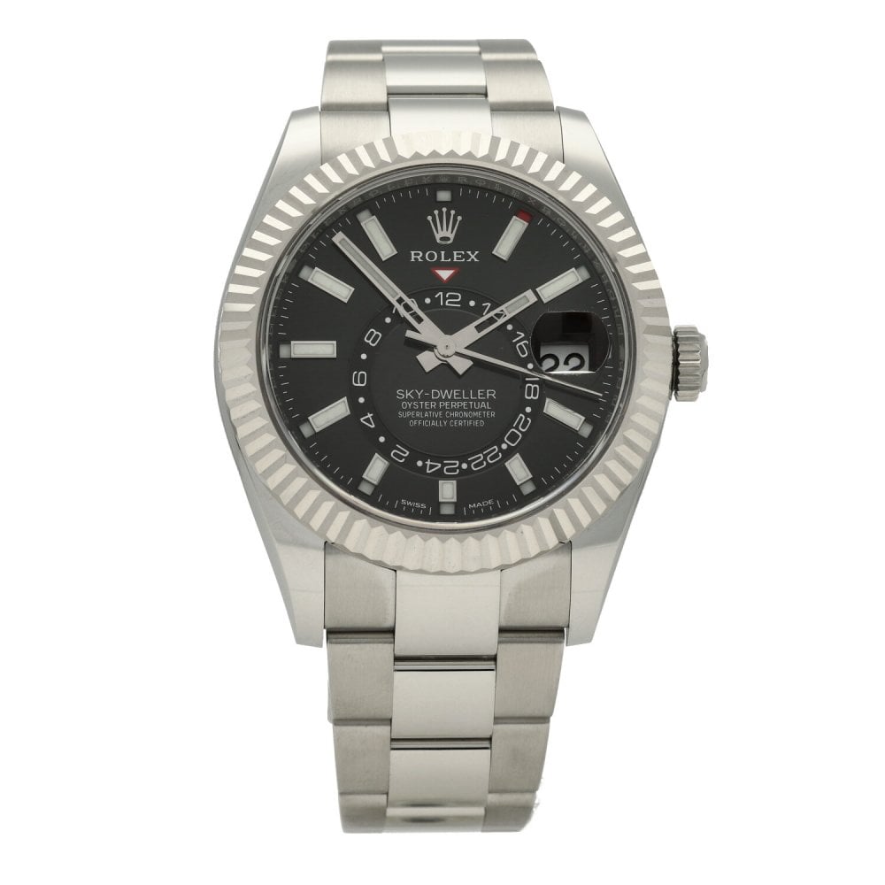 This Rolex Sky-Dweller 326934 has a black baton dial and a bracelet strap. This Rolex has undergone a thorough inspection of water resistance, accuracy, functionality and condition to determine the level of reconditioning required to meet our strict standards. It has also been referenced against technical documents and manufacturer records where available to ensure authenticity and a clean history. All our watches have a 24-month warranty for your peace of mind. One of our skilled polishing technicians has removed marks on the case and bracelet of this watch, brought about by daily wear and tear, which is why this watch does not come with the remaining manufacturer’s warranty.