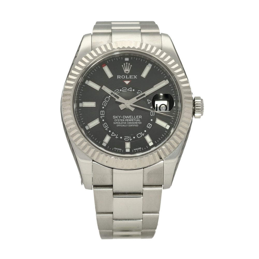 This Rolex Sky-Dweller 326934 has a black baton dial and a bracelet strap. This Rolex has undergone a thorough inspection of water resistance, accuracy, functionality and condition to determine the level of reconditioning required to meet our strict standards. It has also been referenced against technical documents and manufacturer records where available to ensure authenticity and a clean history. All our watches have a 24-month warranty for your peace of mind. One of our skilled polishing technicians has removed marks on the case and bracelet of this watch, brought about by daily wear and tear, which is why this watch does not come with the remaining manufacturer’s warranty.
