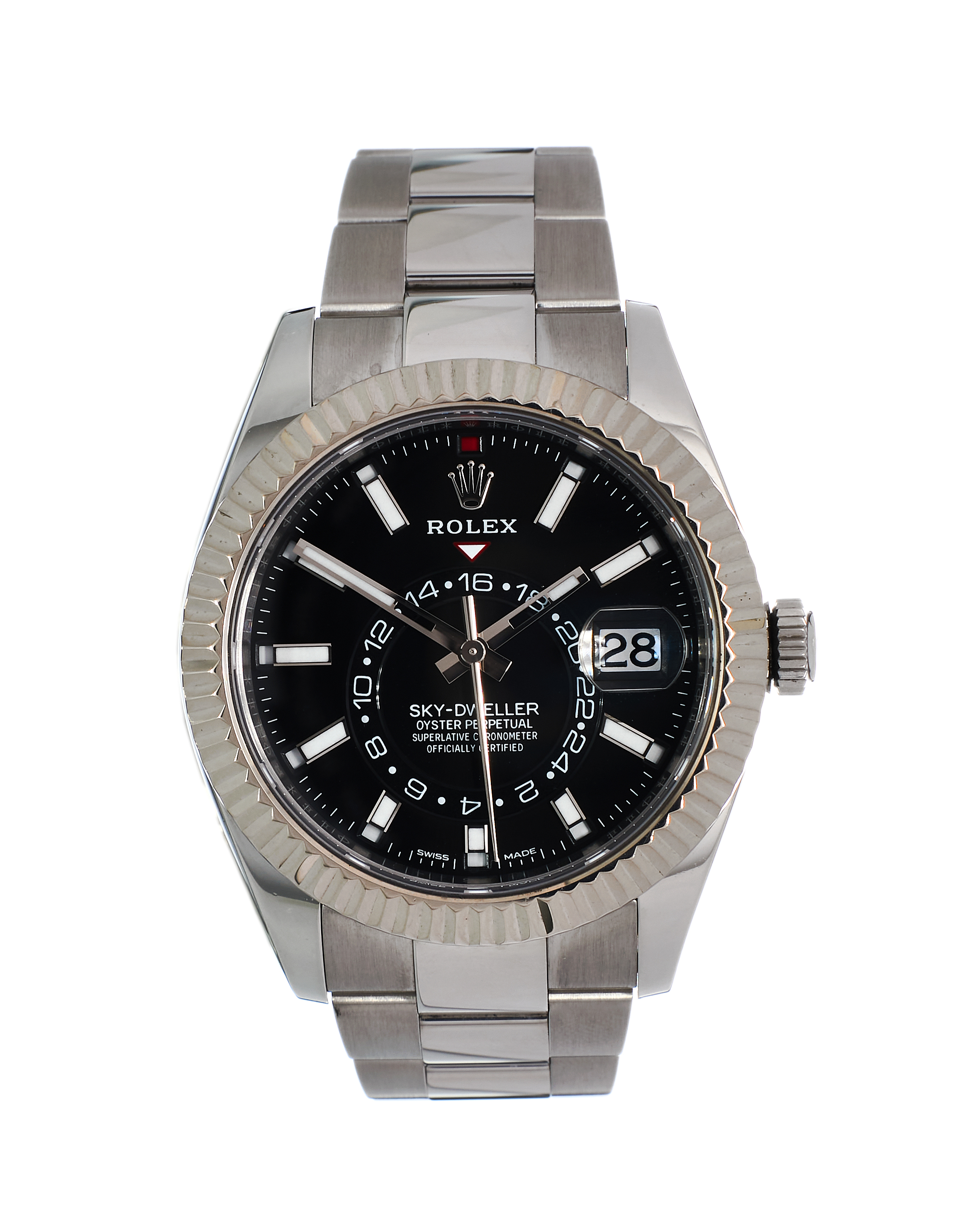 This Rolex Sky-Dweller 326934 has a black baton dial and a bracelet strap. This Rolex has undergone a thorough inspection of water resistance, accuracy, functionality and condition to determine the level of reconditioning required to meet our strict standards. It has also been referenced against technical documents and manufacturer records where available to ensure authenticity and a clean history. All our watches have a 24-month warranty for your peace of mind. One of our skilled polishing technicians has removed marks on the case and bracelet of this watch, brought about by daily wear and tear, which is why this watch does not come with the remaining manufacturer’s warranty.