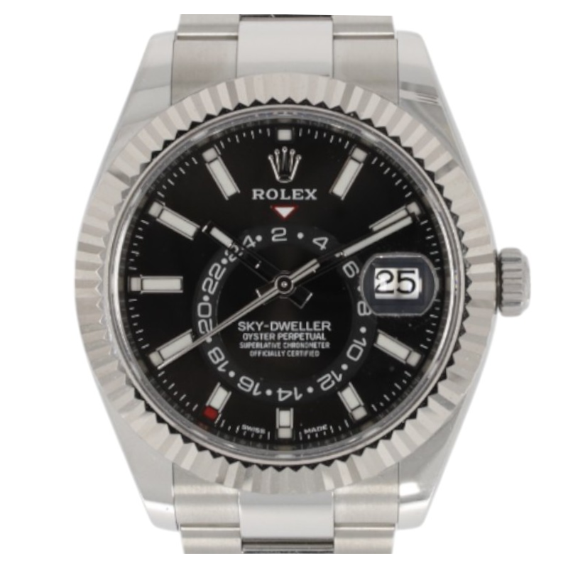 This Rolex Sky-Dweller 326934 has a black baton dial and a bracelet strap. This Rolex has undergone a thorough inspection of water resistance, accuracy, functionality and condition to determine the level of reconditioning required to meet our strict standards. It has also been referenced against technical documents and manufacturer records where available to ensure authenticity and a clean history. All our watches have a 24-month warranty for your peace of mind. One of our skilled polishing technicians has removed marks on the case and bracelet of this watch, brought about by daily wear and tear, which is why this watch does not come with the remaining manufacturer’s warranty.