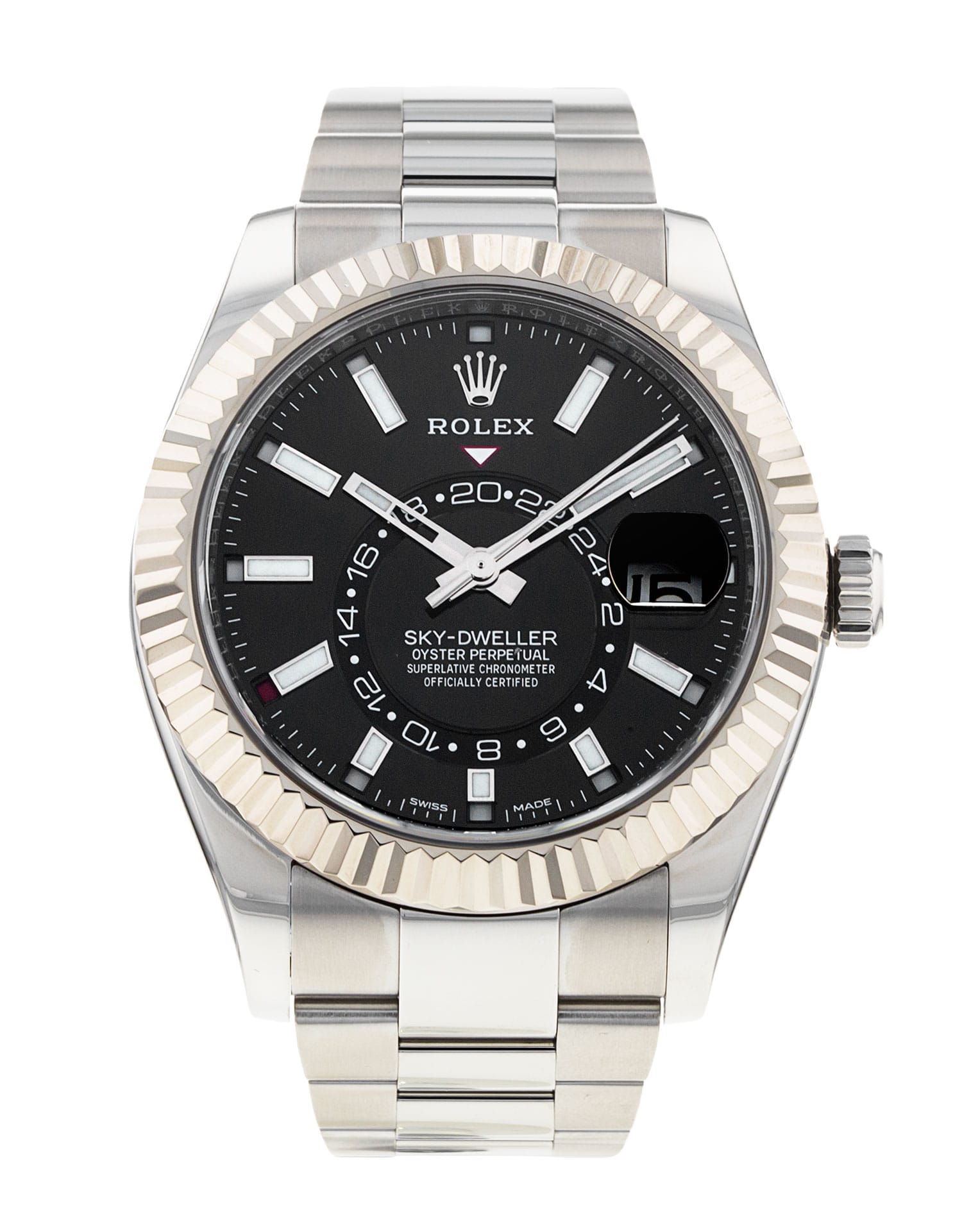 This Rolex Sky-Dweller 326934 has a black baton dial and a bracelet strap. This Rolex has undergone a thorough inspection of water resistance, accuracy, functionality and condition to determine the level of reconditioning required to meet our strict standards. It has also been referenced against technical documents and manufacturer records where available to ensure authenticity and a clean history. All our watches have a 24-month warranty for your peace of mind. One of our skilled polishing technicians has removed marks on the case and bracelet of this watch, brought about by daily wear and tear, which is why this watch does not come with the remaining manufacturer’s warranty.