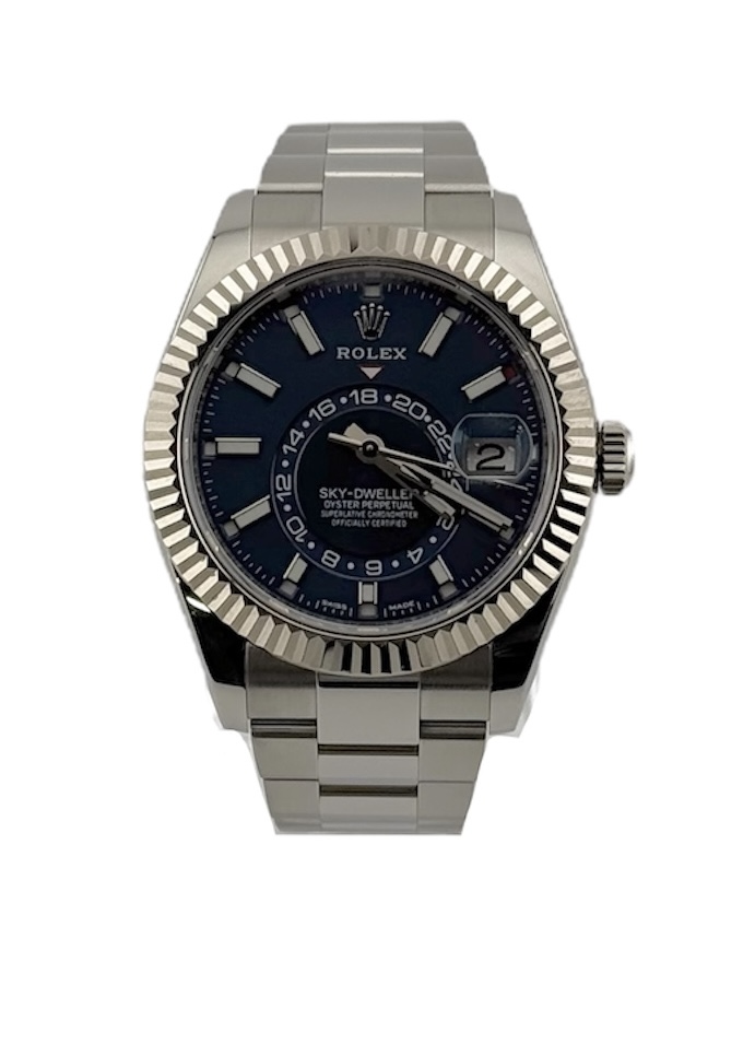 This Rolex Sky-Dweller 326934 has a blue baton dial and a bracelet strap. This Rolex has undergone a thorough inspection of water resistance, accuracy, functionality and condition to determine the level of reconditioning required to meet our strict standards. It has also been referenced against technical documents and manufacturer records where available to ensure authenticity and a clean history. All our watches have a 24-month warranty for your peace of mind. One of our skilled polishing technicians has removed marks on the case and bracelet of this watch, brought about by daily wear and tear, which is why this watch does not come with the remaining manufacturer’s warranty.
