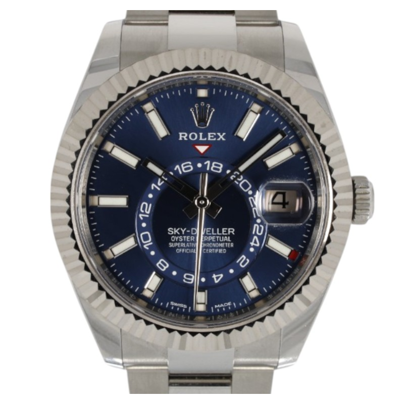 This Rolex Sky-Dweller 326934 has a blue baton dial and a bracelet strap. This Rolex has undergone a thorough inspection of water resistance, accuracy, functionality and condition to determine the level of reconditioning required to meet our strict standards. It has also been referenced against technical documents and manufacturer records where available to ensure authenticity and a clean history. Our watches have a 24-month warranty for your peace of mind, in conjunction with any remaining manufacturer’s warranty from new or from service. To maintain the manufacturer’s warranty on this watch, it has not been polished in our service centre.