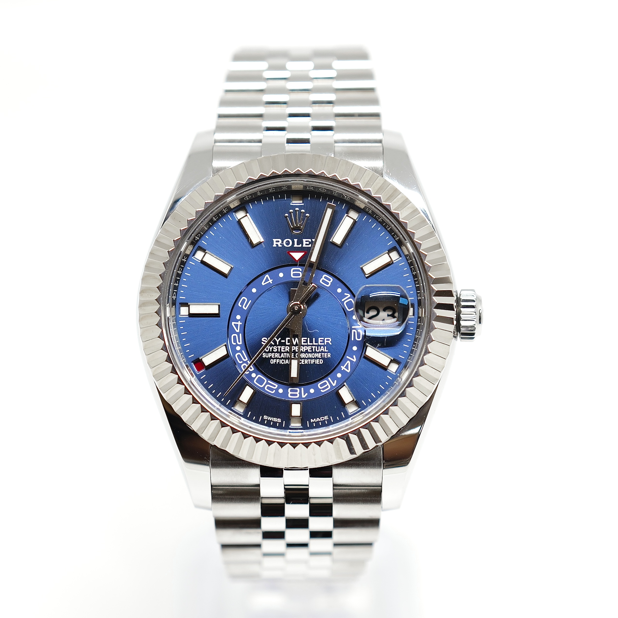 This Rolex Sky-Dweller 326934 has a blue baton dial and a bracelet strap. This Rolex has undergone a thorough inspection of water resistance, accuracy, functionality and condition to determine the level of reconditioning required to meet our strict standards. It has also been referenced against technical documents and manufacturer records where available to ensure authenticity and a clean history. Our watches have a 24-month warranty for your peace of mind, in conjunction with any remaining manufacturer’s warranty from new or from service. To maintain the manufacturer’s warranty on this watch, it has not been polished in our service centre.