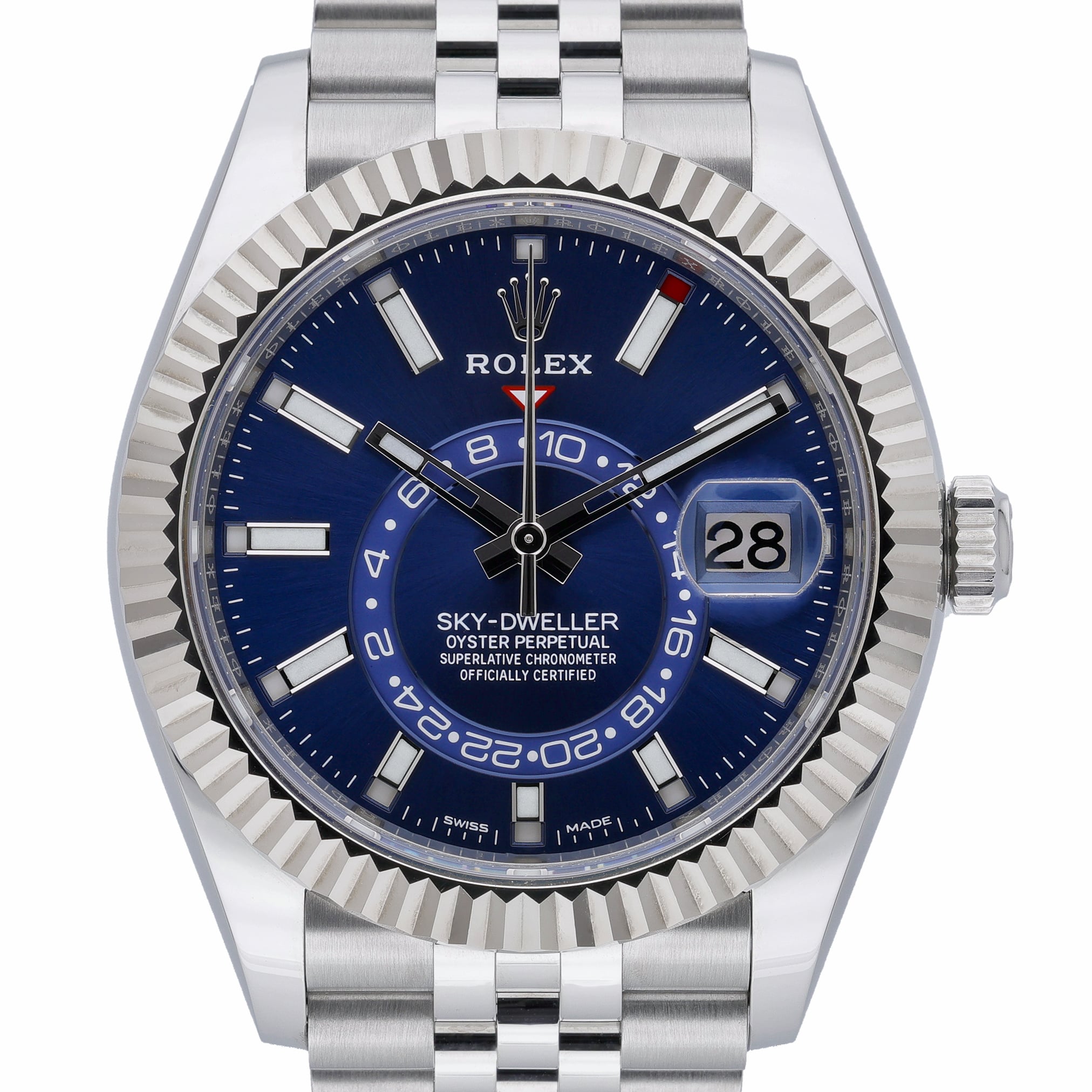 This Rolex Sky-Dweller 326934 has a blue baton dial and a bracelet strap. This Rolex has undergone a thorough inspection of water resistance, accuracy, functionality and condition to determine the level of reconditioning required to meet our strict standards. It has also been referenced against technical documents and manufacturer records where available to ensure authenticity and a clean history. Our watches have a 24-month warranty for your peace of mind, in conjunction with any remaining manufacturer’s warranty from new or from service. To maintain the manufacturer’s warranty on this watch, it has not been polished in our service centre.