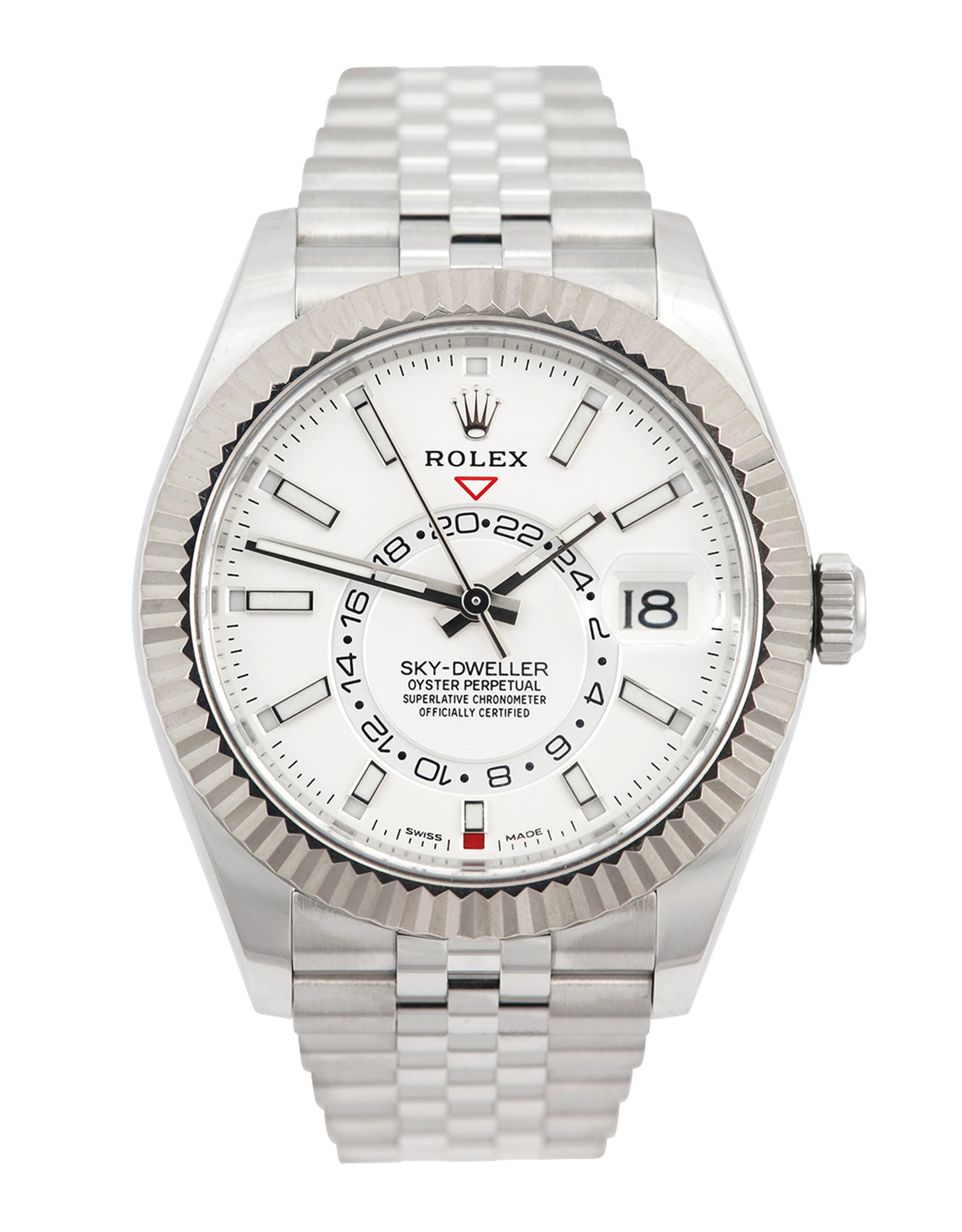 This Rolex Sky-Dweller 326934 has a white baton dial and a bracelet strap. This Rolex has undergone a thorough inspection of water resistance, accuracy, functionality and condition to determine the level of reconditioning required to meet our strict standards. It has also been referenced against technical documents and manufacturer records where available to ensure authenticity and a clean history. Our watches have a 24-month warranty for your peace of mind, in conjunction with any remaining manufacturer’s warranty from new or from service. To maintain the manufacturer’s warranty on this watch, it has not been polished in our service centre.