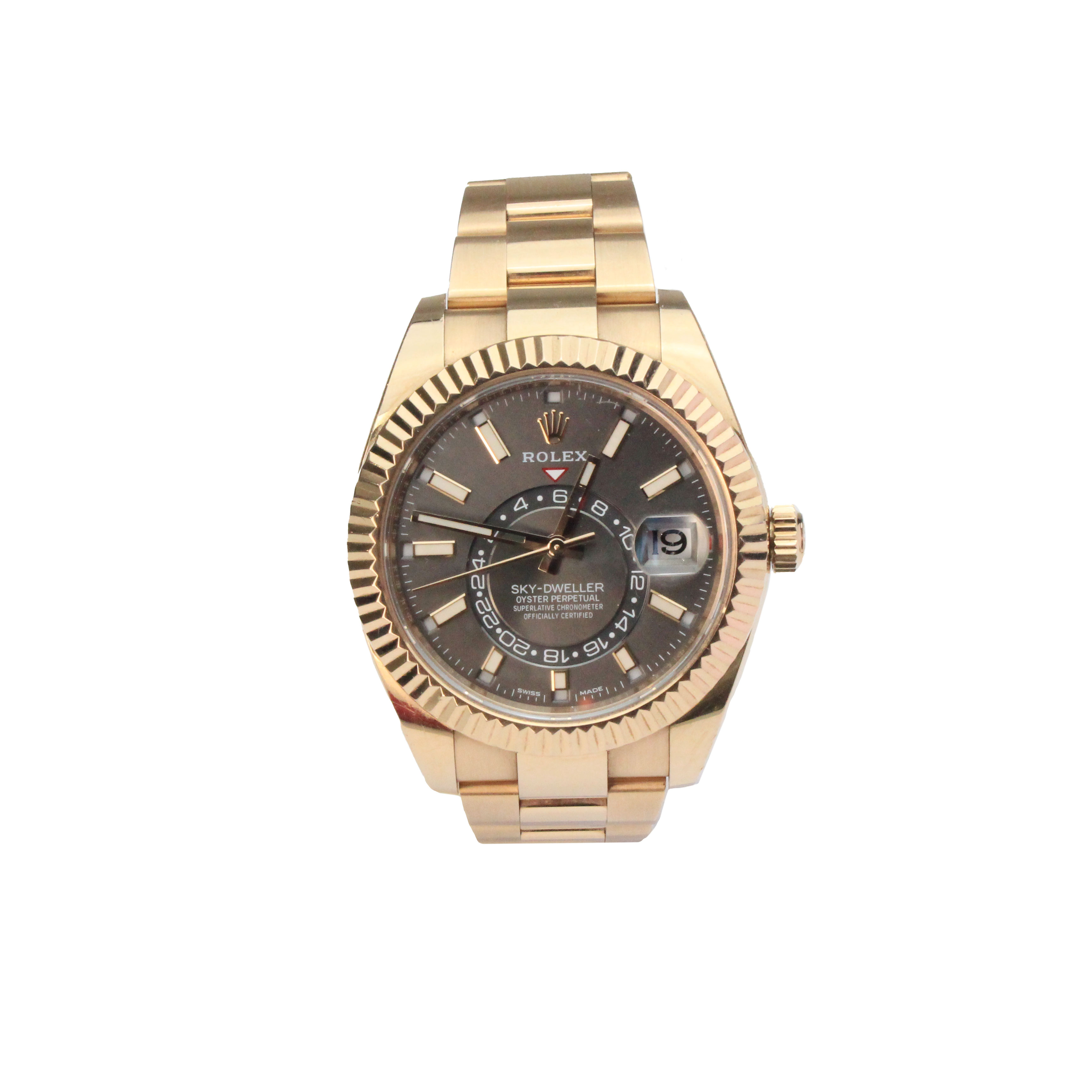 This Rolex Sky-Dweller 326935 has a white baton dial and a bracelet strap. This Rolex has undergone a thorough inspection of water resistance, accuracy, functionality and condition to determine the level of reconditioning required to meet our strict standards. It has also been referenced against technical documents and manufacturer records where available to ensure authenticity and a clean history. All our watches have a 24-month warranty for your peace of mind. One of our skilled polishing technicians has removed marks on the case and bracelet of this watch, brought about by daily wear and tear, which is why this watch does not come with the remaining manufacturer’s warranty.