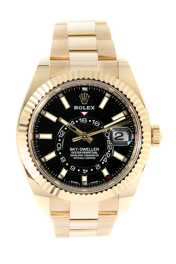 This Rolex Sky-Dweller 326938 has a black baton dial and a bracelet strap. This Rolex has undergone a thorough inspection of water resistance, accuracy, functionality and condition to determine the level of reconditioning required to meet our strict standards. It has also been referenced against technical documents and manufacturer records where available to ensure authenticity and a clean history. Our watches have a 24-month warranty for your peace of mind, in conjunction with any remaining manufacturer’s warranty from new or from service. To maintain the manufacturer’s warranty on this watch, it has not been polished in our service centre.