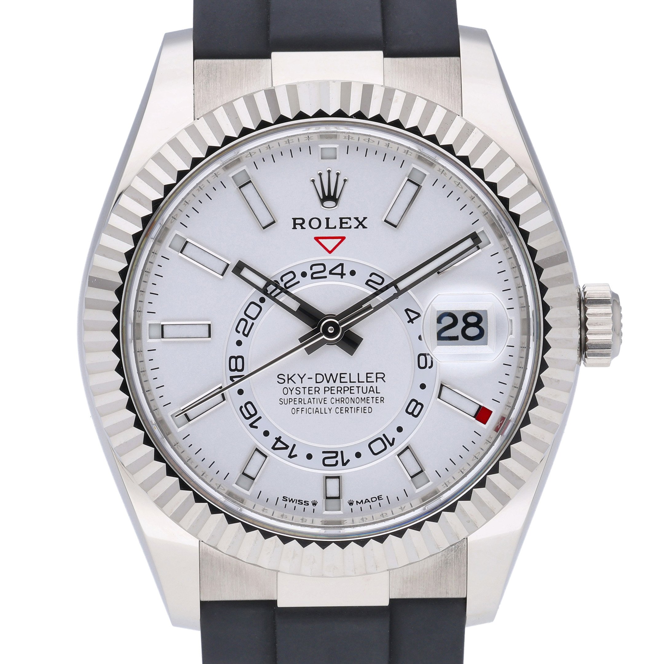 This Rolex Sky-Dweller 336239 has a white dial and a rubber strap. This Rolex has undergone a thorough inspection of water resistance, accuracy, functionality and condition to determine the level of reconditioning required to meet our strict standards. It has also been referenced against technical documents and manufacturer records where available to ensure authenticity and a clean history. Our watches have a 24-month warranty for your peace of mind, in conjunction with any remaining manufacturer’s warranty from new or from service. To maintain the manufacturer’s warranty on this watch, it has not been polished in our service centre.