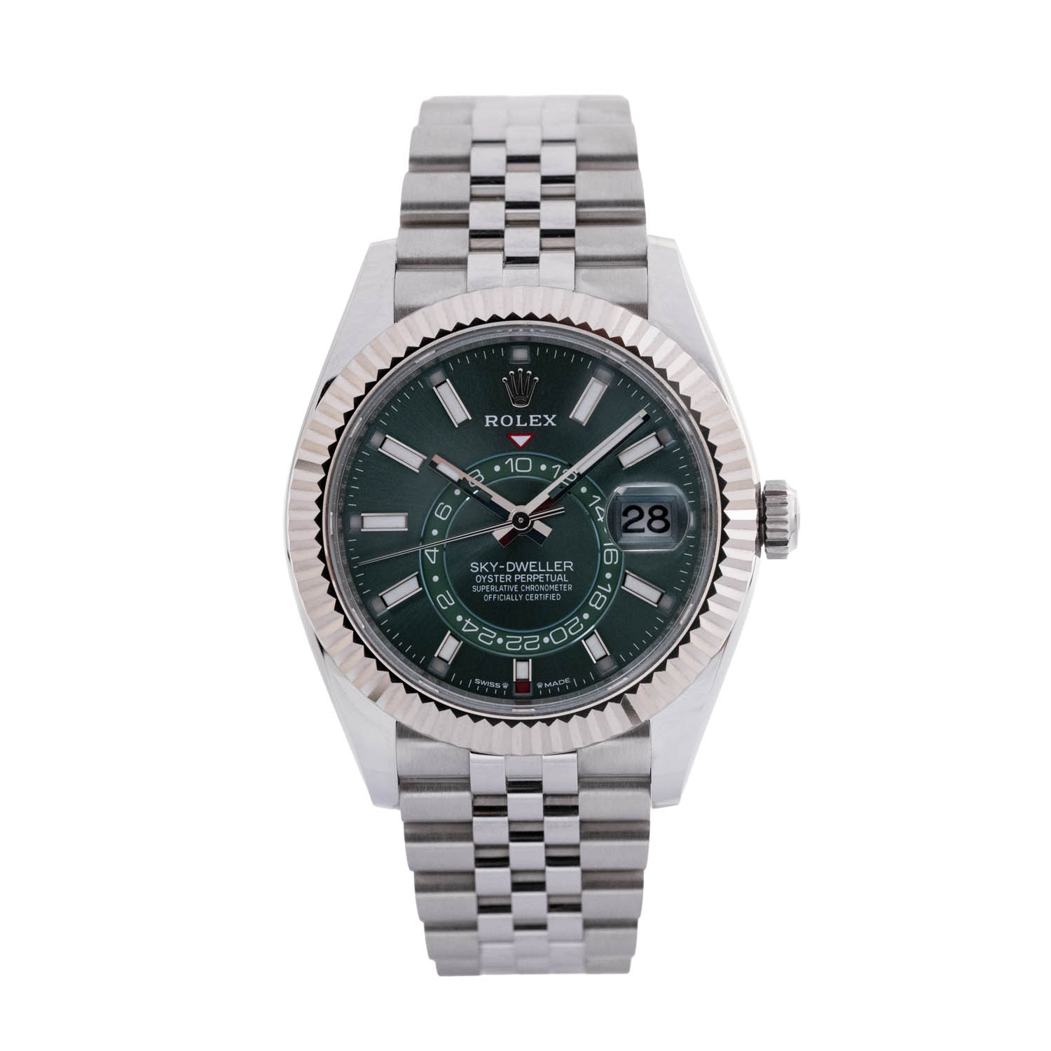 This Rolex Sky-Dweller 336934 has a mint green baton dial and a bracelet strap. This Rolex has undergone a thorough inspection of water resistance, accuracy, functionality and condition to determine the level of reconditioning required to meet our strict standards. It has also been referenced against technical documents and manufacturer records where available to ensure authenticity and a clean history. Our watches have a 24-month warranty for your peace of mind, in conjunction with any remaining manufacturer’s warranty from new or from service. To maintain the manufacturer’s warranty on this watch, it has not been polished in our service centre.