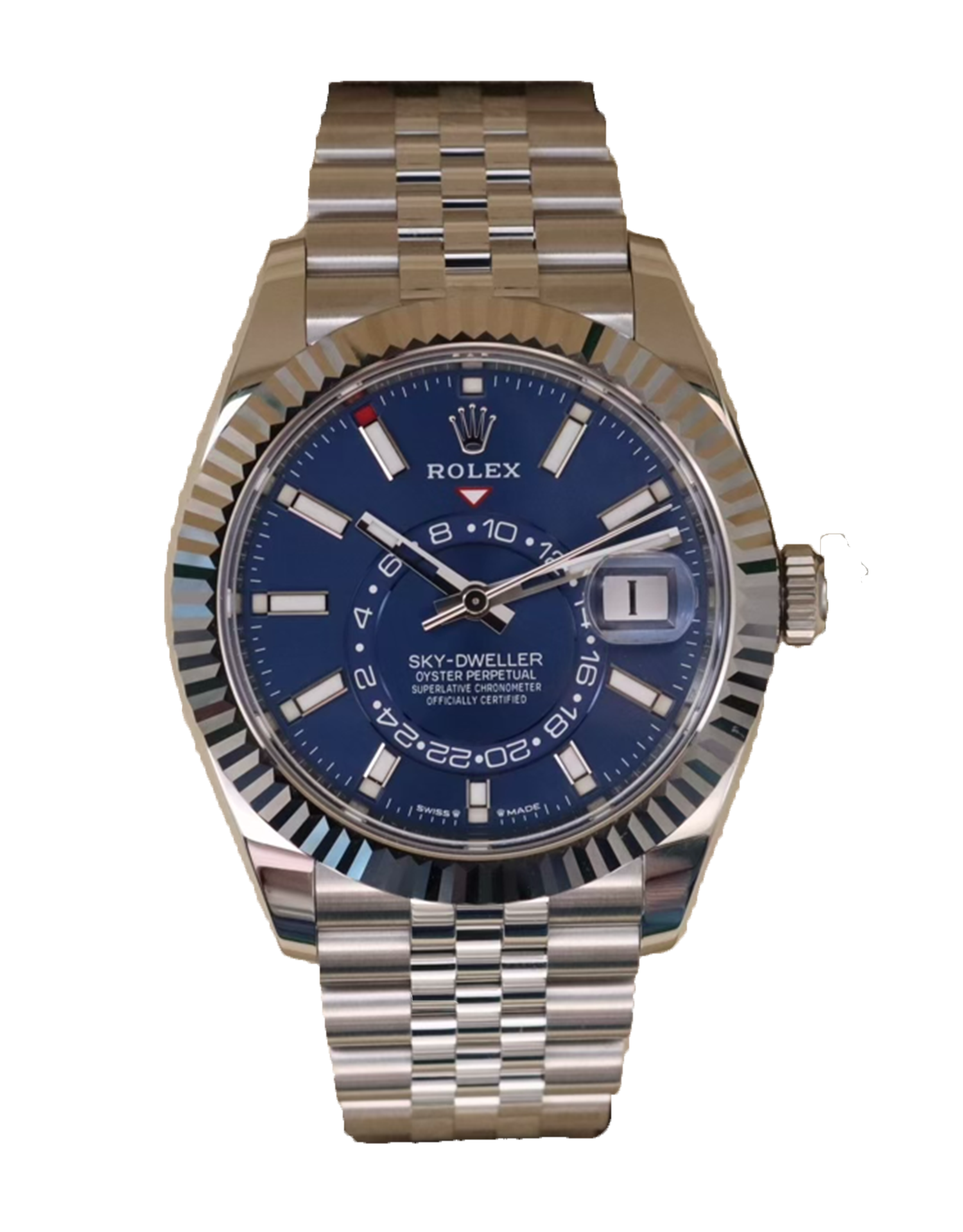 This Rolex Sky-Dweller 336934 has a blue dial and a bracelet strap. This Rolex has undergone a thorough inspection of water resistance, accuracy, functionality and condition to determine the level of reconditioning required to meet our strict standards. It has also been referenced against technical documents and manufacturer records where available to ensure authenticity and a clean history. Our watches have a 24-month warranty for your peace of mind, in conjunction with any remaining manufacturer’s warranty from new or from service. To maintain the manufacturer’s warranty on this watch, it has not been polished in our service centre.