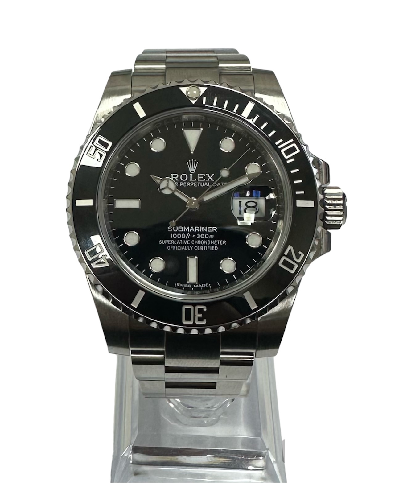 There's no other watch like the Submariner, the peerless tool for divers that has enjoyed an unmatched reputation since its introduction in 1953. The watch is prized for its versatility—sporty and durable enough to be useful for professional diving, possessed of the elegance needed for a black tie event, and with a design so classic it could be worn every day to the office. This stunning version updates the previous reference 16610 with high-tech specs, including the ceramic insert with platinum-coated numerals in the bezel, not to mention the superb calibre 3135 inside.