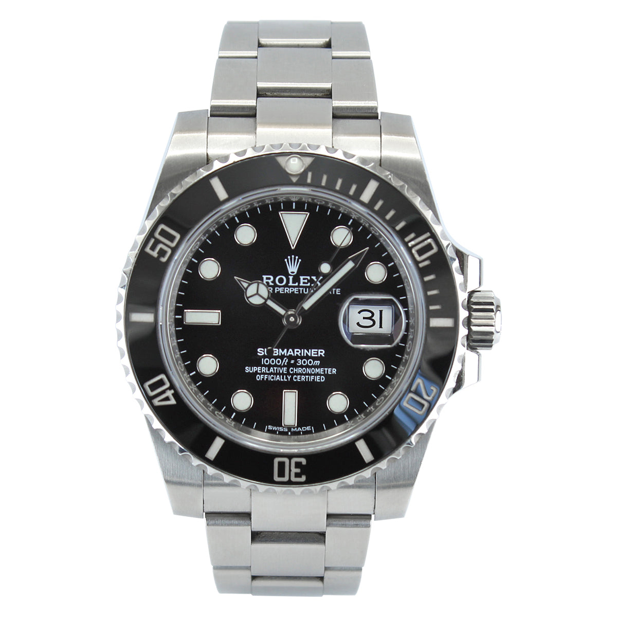 This Rolex Submariner 116610 LN has a black dial and a bracelet strap. This Rolex has undergone a thorough inspection of water resistance, accuracy, functionality and condition to determine the level of reconditioning required to meet our strict standards. It has also been referenced against technical documents and manufacturer records where available to ensure authenticity and a clean history. All our watches have a 24-month warranty for your peace of mind. One of our skilled polishing technicians has removed marks on the case and bracelet of this watch, brought about by daily wear and tear, which is why this watch does not come with the remaining manufacturer’s warranty.