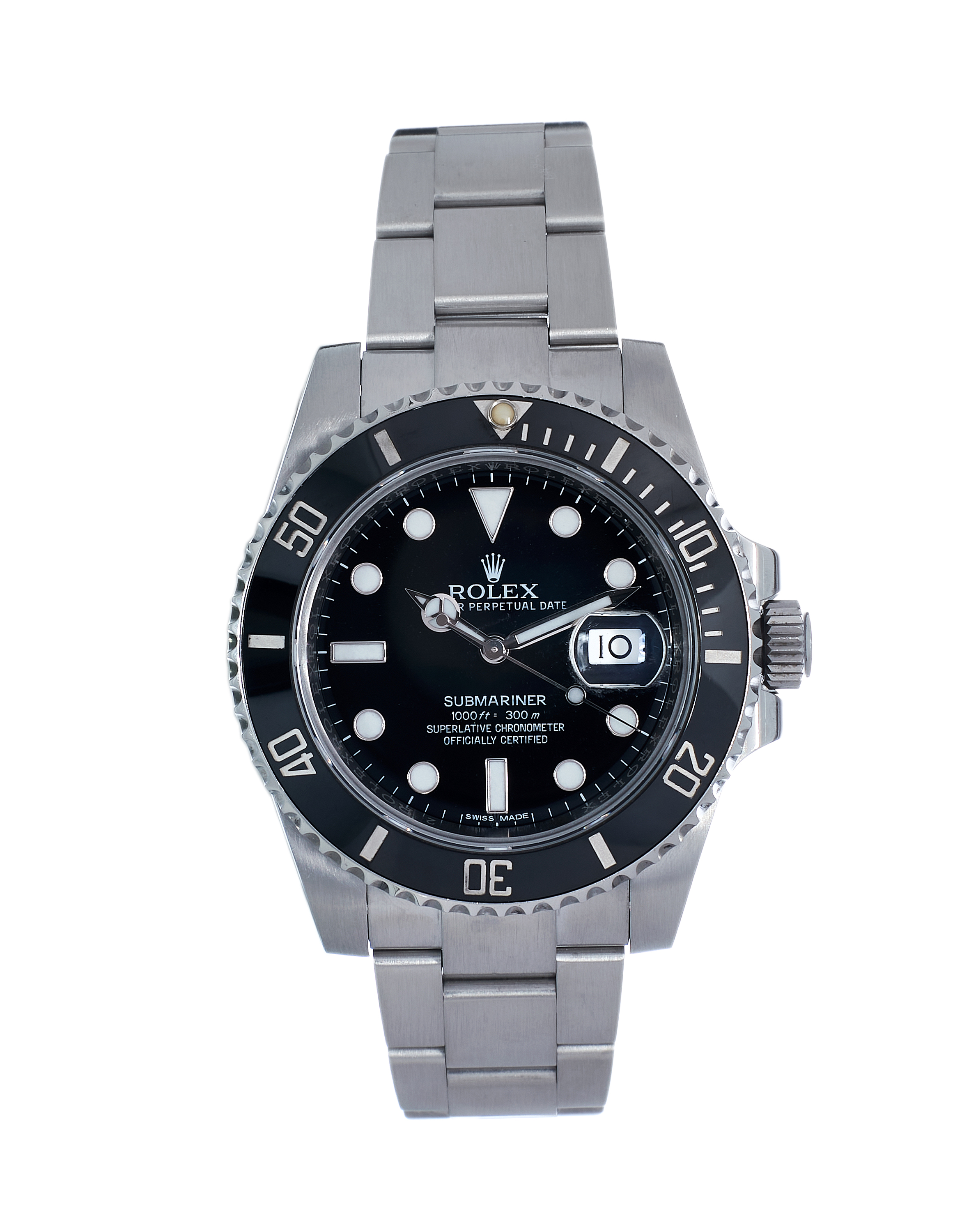 There's no other watch like the Submariner, the peerless tool for divers that has enjoyed an unmatched reputation since its introduction in 1953. The watch is prized for its versatility—sporty and durable enough to be useful for professional diving, possessed of the elegance needed for a black tie event, and with a design so classic it could be worn every day to the office. This stunning version updates the previous reference 16610 with high-tech specs, including the ceramic insert with platinum-coated numerals in the bezel, not to mention the superb calibre 3135 inside.