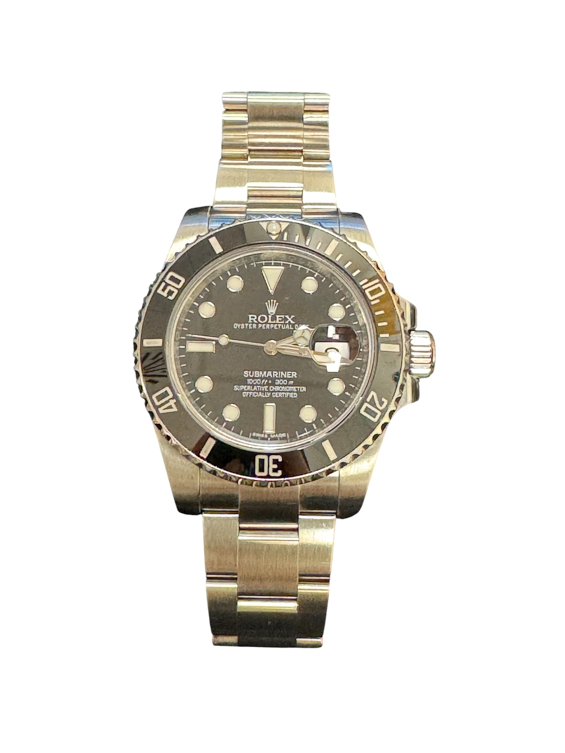 This Rolex Submariner 116610 LN has a black dial and a bracelet strap. This Rolex has undergone a thorough inspection of water resistance, accuracy, functionality and condition to determine the level of reconditioning required to meet our strict standards. It has also been referenced against technical documents and manufacturer records where available to ensure authenticity and a clean history. All our watches have a 24-month warranty for your peace of mind. One of our skilled polishing technicians has removed marks on the case and bracelet of this watch, brought about by daily wear and tear, which is why this watch does not come with the remaining manufacturer’s warranty.