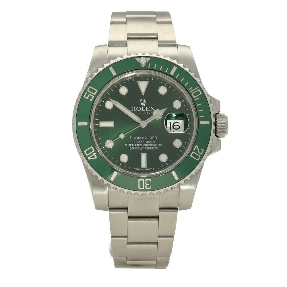 This Rolex Submariner 116610 LV has a green dial and a bracelet strap. This Rolex has undergone a thorough inspection of water resistance, accuracy, functionality and condition to determine the level of reconditioning required to meet our strict standards. It has also been referenced against technical documents and manufacturer records where available to ensure authenticity and a clean history. All our watches have a 24-month warranty for your peace of mind. One of our skilled polishing technicians has removed marks on the case and bracelet of this watch, brought about by daily wear and tear, which is why this watch does not come with the remaining manufacturer’s warranty.