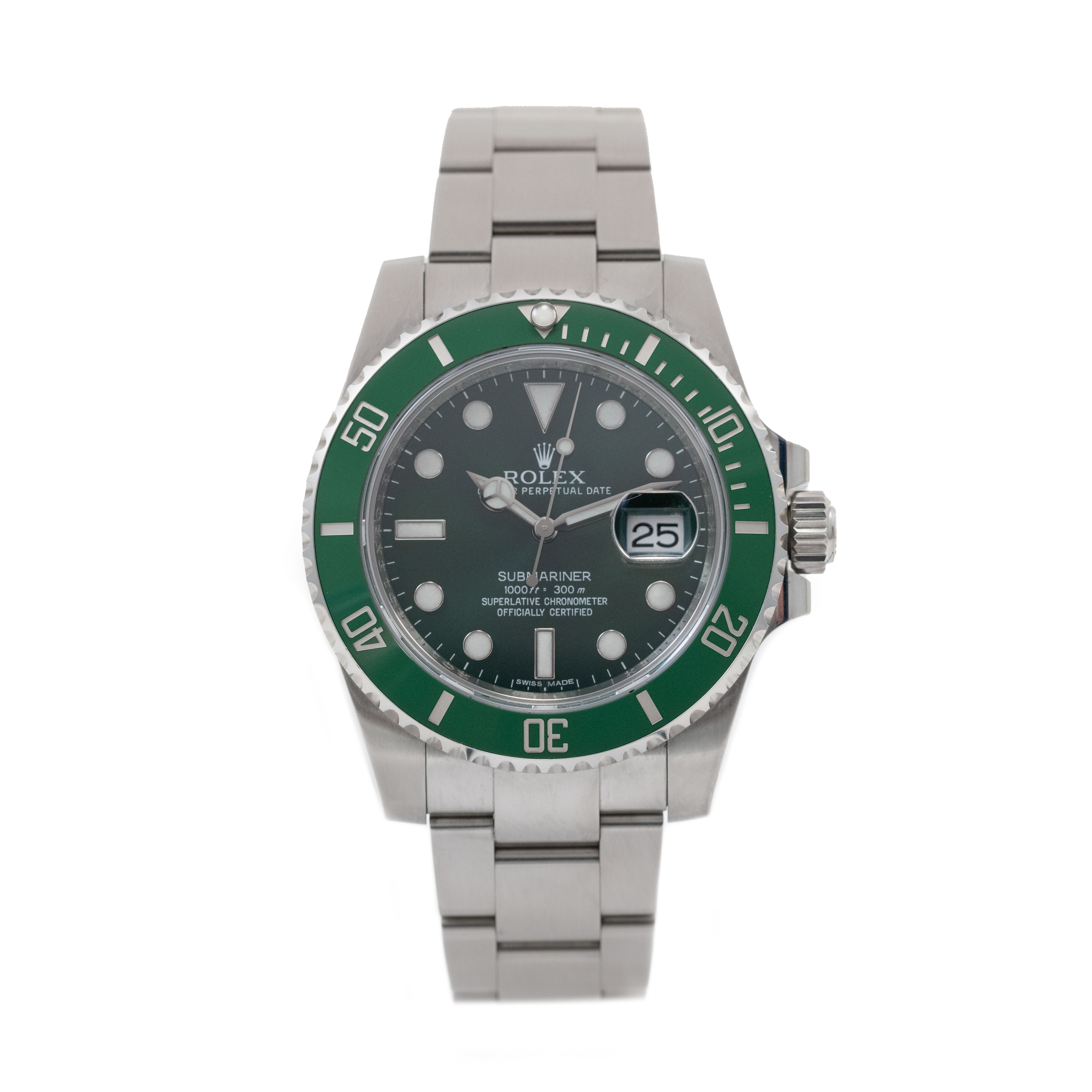 This Rolex Submariner 116610 LV has a green dial and a bracelet strap. This Rolex has undergone a thorough inspection of water resistance, accuracy, functionality and condition to determine the level of reconditioning required to meet our strict standards. It has also been referenced against technical documents and manufacturer records where available to ensure authenticity and a clean history. All our watches have a 24-month warranty for your peace of mind. One of our skilled polishing technicians has removed marks on the case and bracelet of this watch, brought about by daily wear and tear, which is why this watch does not come with the remaining manufacturer’s warranty.