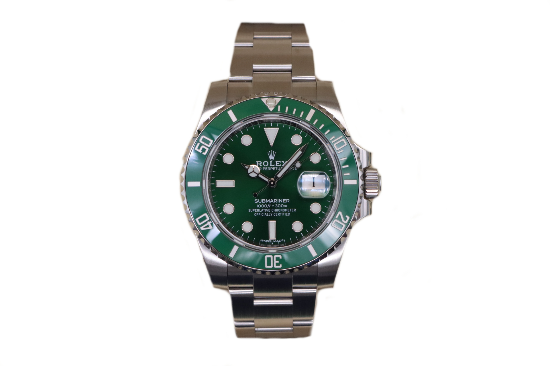 This Rolex Submariner 116610 LV has a green dial and a bracelet strap. This Rolex has undergone a thorough inspection of water resistance, accuracy, functionality and condition to determine the level of reconditioning required to meet our strict standards. It has also been referenced against technical documents and manufacturer records where available to ensure authenticity and a clean history. All our watches have a 24-month warranty for your peace of mind. One of our skilled polishing technicians has removed marks on the case and bracelet of this watch, brought about by daily wear and tear, which is why this watch does not come with the remaining manufacturer’s warranty.