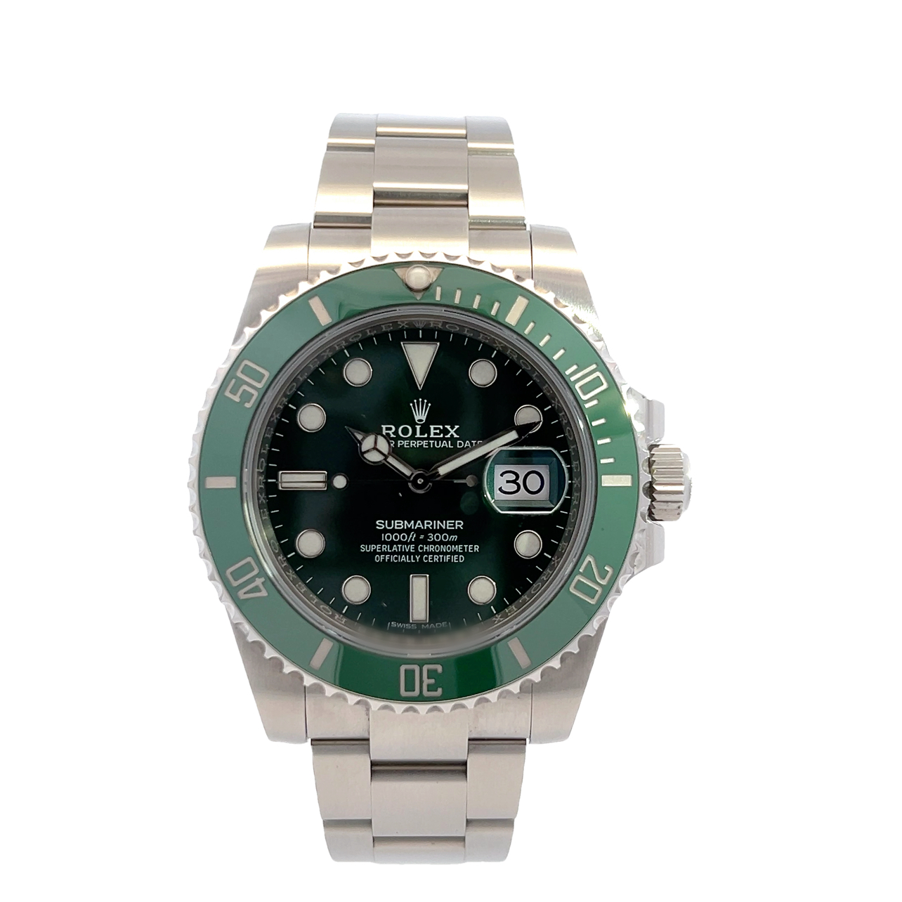 This Rolex Submariner 116610 LV has a green dial and a bracelet strap. This Rolex has undergone a thorough inspection of water resistance, accuracy, functionality and condition to determine the level of reconditioning required to meet our strict standards. It has also been referenced against technical documents and manufacturer records where available to ensure authenticity and a clean history. All our watches have a 24-month warranty for your peace of mind. One of our skilled polishing technicians has removed marks on the case and bracelet of this watch, brought about by daily wear and tear, which is why this watch does not come with the remaining manufacturer’s warranty.