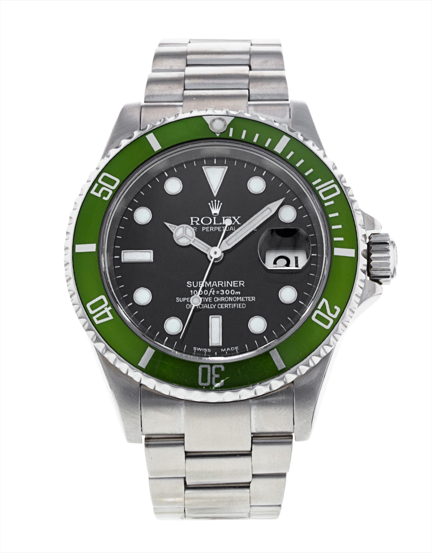 This Rolex Submariner 16610 LV Flat Four has a black dial and a bracelet strap. This Rolex has undergone a thorough inspection of water resistance, accuracy, functionality and condition to determine the level of reconditioning required to meet our strict standards. It has also been referenced against technical documents and manufacturer records where available to ensure authenticity and a clean history. All our watches have a 24-month warranty for your peace of mind. One of our skilled polishing technicians has removed marks on the case and bracelet of this watch, brought about by daily wear and tear, which is why this watch does not come with the remaining manufacturer’s warranty.