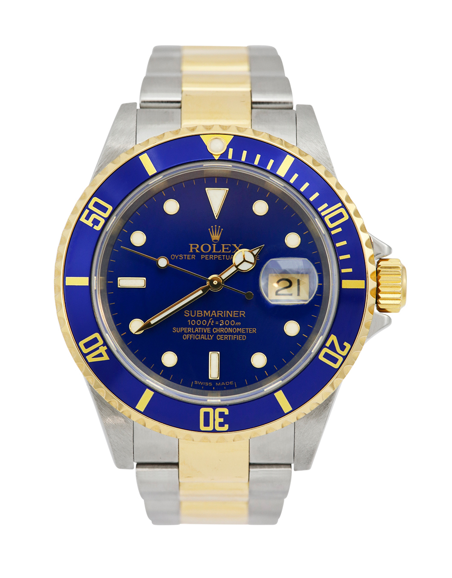 This Rolex Submariner 16613 has a blue dial and a bracelet strap. This Rolex has undergone a thorough inspection of water resistance, accuracy, functionality and condition to determine the level of reconditioning required to meet our strict standards. It has also been referenced against technical documents and manufacturer records where available to ensure authenticity and a clean history. Our watches have a 24-month warranty for your peace of mind, in conjunction with any remaining manufacturer’s warranty from new or from service. To maintain the manufacturer’s warranty on this watch, it has not been polished in our service centre.