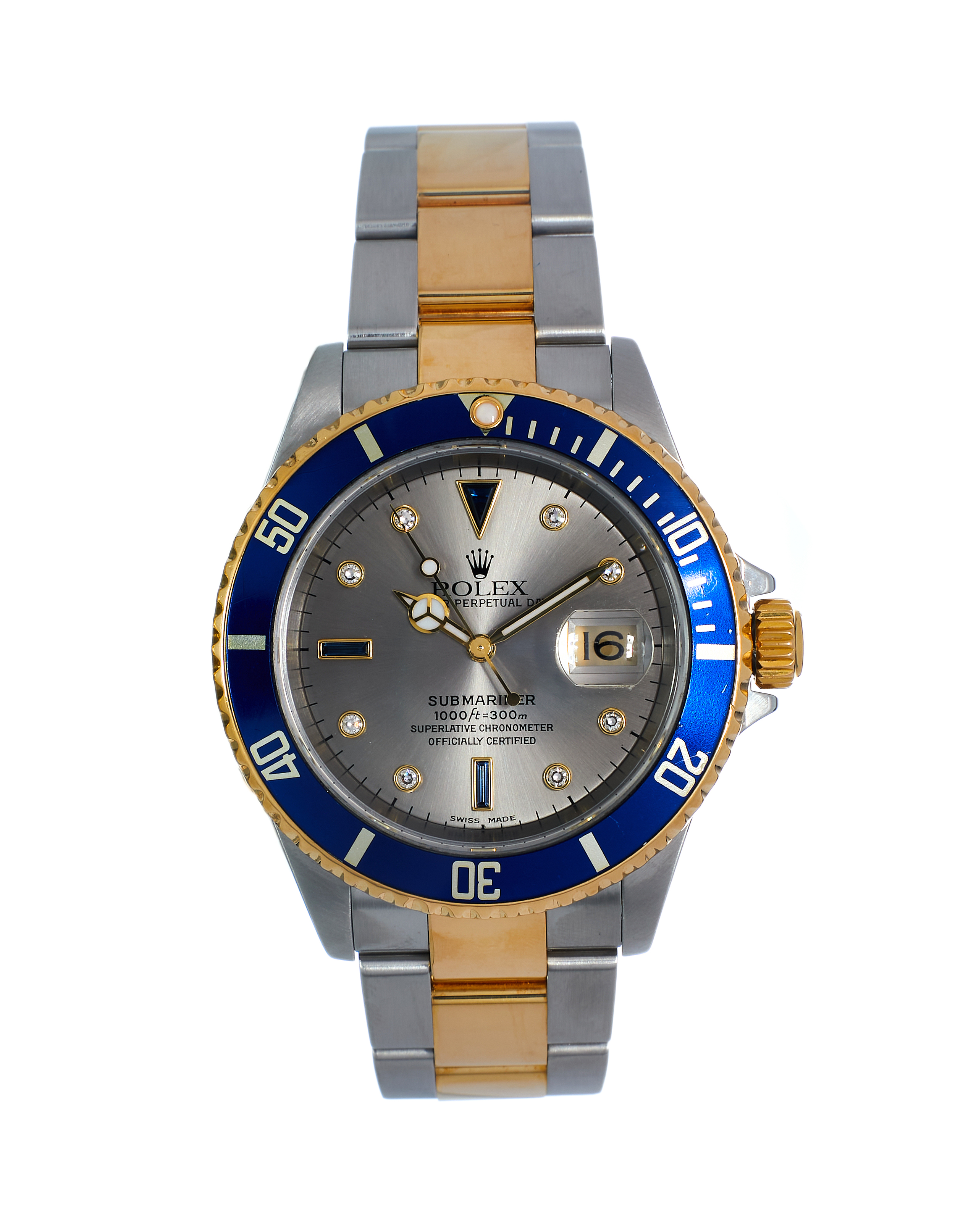 This Rolex Submariner 16613 has a silver diamond & sapphire dial and a bracelet strap. This Rolex has undergone a thorough inspection of water resistance, accuracy, functionality and condition to determine the level of reconditioning required to meet our strict standards. It has also been referenced against technical documents and manufacturer records where available to ensure authenticity and a clean history. All our watches have a 24-month warranty for your peace of mind. One of our skilled polishing technicians has removed marks on the case and bracelet of this watch, brought about by daily wear and tear, which is why this watch does not come with the remaining manufacturer’s warranty.