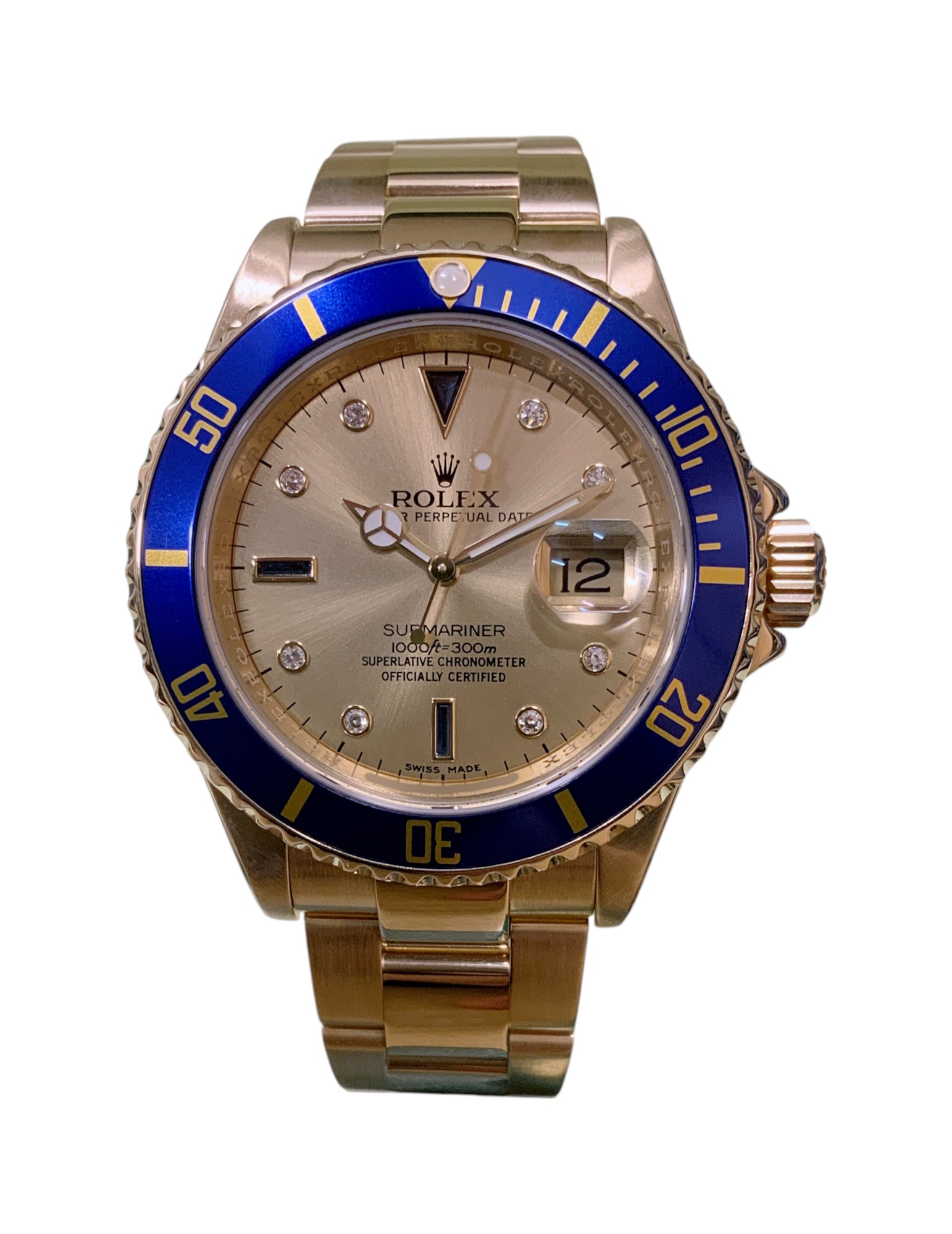 This Rolex Submariner 16618 has a champagne diamonds & sapphires dial and a bracelet strap. This Rolex has undergone a thorough inspection of water resistance, accuracy, functionality and condition to determine the level of reconditioning required to meet our strict standards. It has also been referenced against technical documents and manufacturer records where available to ensure authenticity and a clean history. Our watches have a 24-month warranty for your peace of mind, in conjunction with any remaining manufacturer’s warranty from new or from service. To maintain the manufacturer’s warranty on this watch, it has not been polished in our service centre.