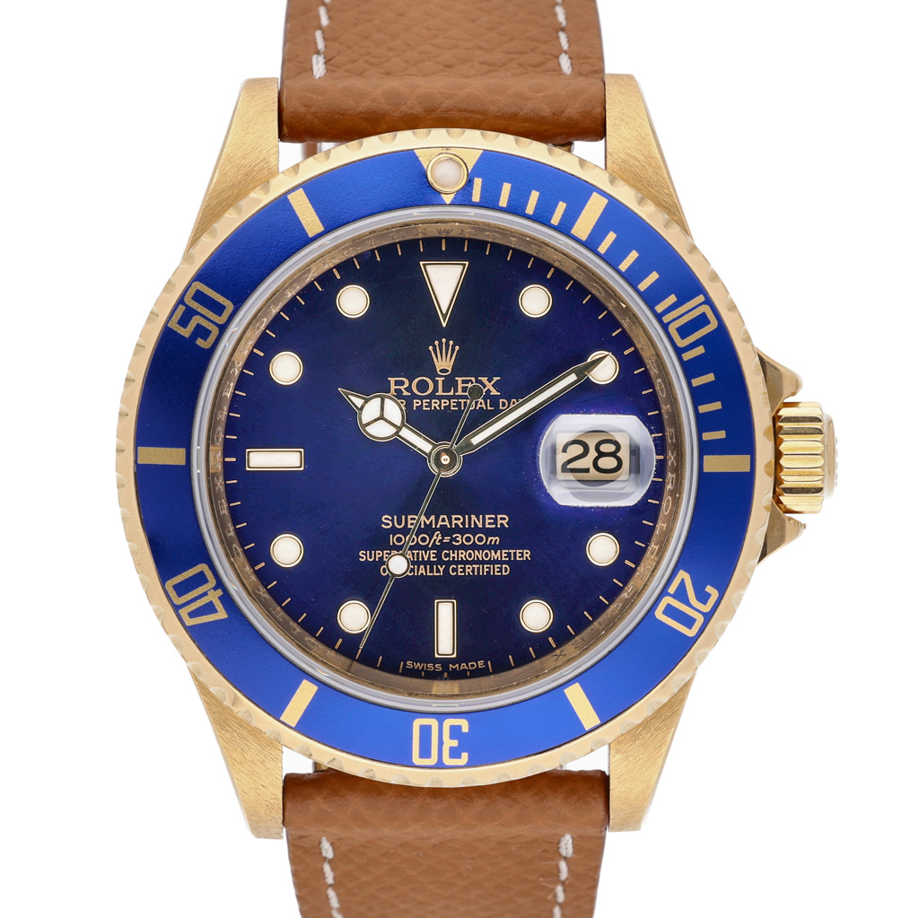 This Rolex Submariner 16618 has a blue dial and a leather strap. This Rolex has undergone a thorough inspection of water resistance, accuracy, functionality and condition to determine the level of reconditioning required to meet our strict standards. It has also been referenced against technical documents and manufacturer records where available to ensure authenticity and a clean history. All our watches have a 24-month warranty for your peace of mind. One of our skilled polishing technicians has removed marks on the case and bracelet of this watch, brought about by daily wear and tear, which is why this watch does not come with the remaining manufacturer’s warranty.