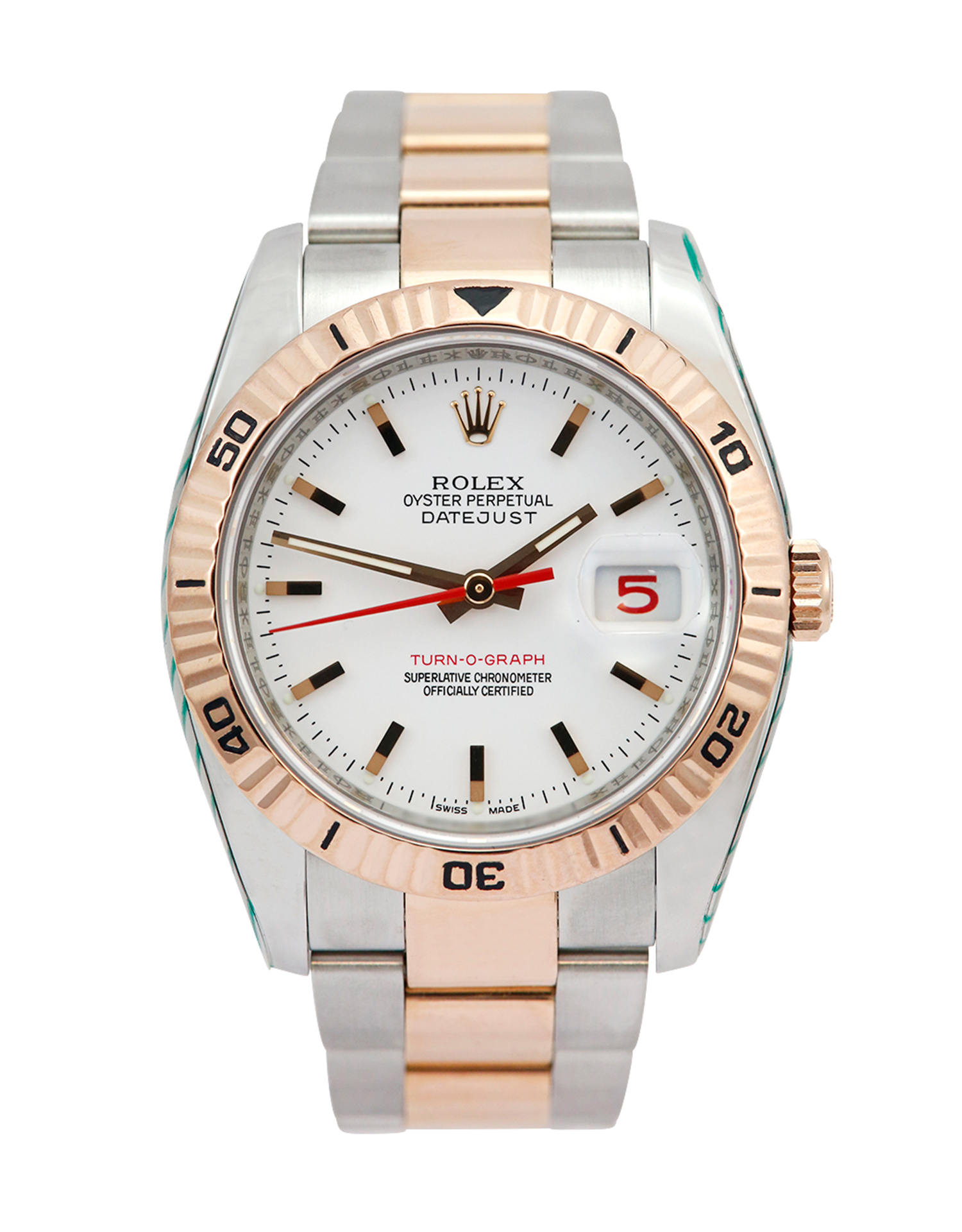 This Rolex Turn-O-Graph 116261 has a white baton dial and a bracelet strap. This Rolex has undergone a thorough inspection of water resistance, accuracy, functionality and condition to determine the level of reconditioning required to meet our strict standards. It has also been referenced against technical documents and manufacturer records where available to ensure authenticity and a clean history. Our watches have a 24-month warranty for your peace of mind, in conjunction with any remaining manufacturer’s warranty from new or from service. To maintain the manufacturer’s warranty on this watch, it has not been polished in our service centre.