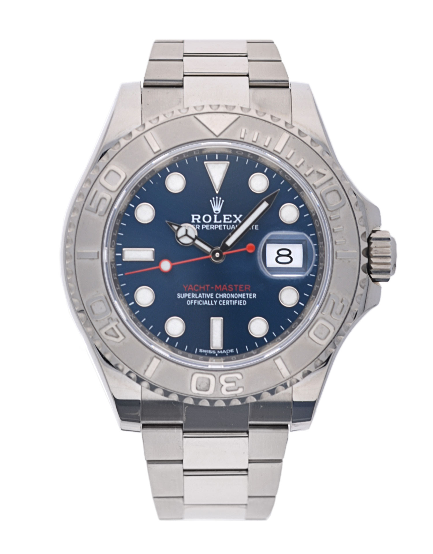 This Rolex Yacht-Master 116622 has a blue dial and a bracelet strap. This Rolex has undergone a thorough inspection of water resistance, accuracy, functionality and condition to determine the level of reconditioning required to meet our strict standards. It has also been referenced against technical documents and manufacturer records where available to ensure authenticity and a clean history. All our watches have a 24-month warranty for your peace of mind. One of our skilled polishing technicians has removed marks on the case and bracelet of this watch, brought about by daily wear and tear, which is why this watch does not come with the remaining manufacturer’s warranty.
