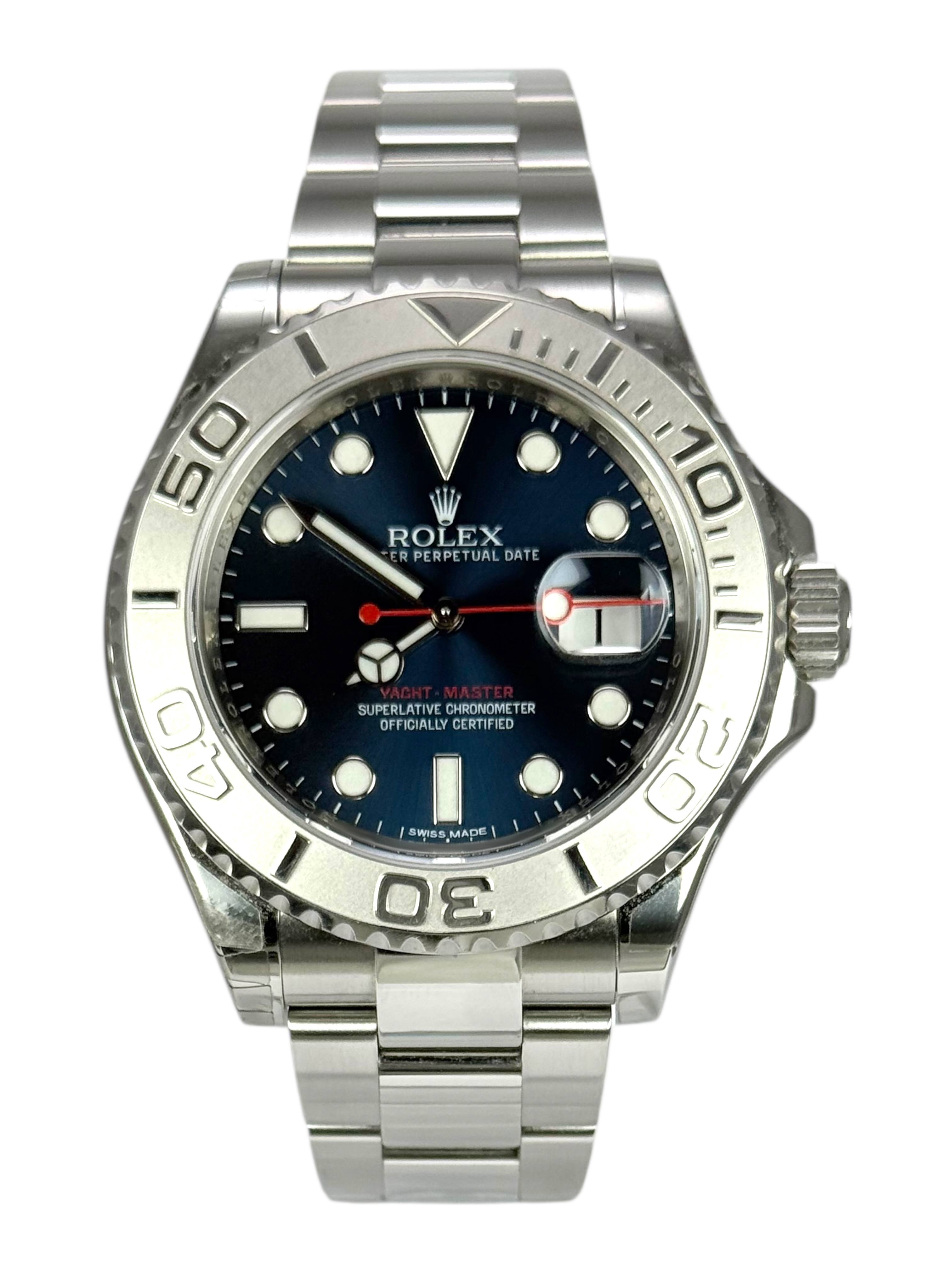 This Rolex Yacht-Master 116622 has a blue dial and a bracelet strap. This Rolex has undergone a thorough inspection of water resistance, accuracy, functionality and condition to determine the level of reconditioning required to meet our strict standards. It has also been referenced against technical documents and manufacturer records where available to ensure authenticity and a clean history. All our watches have a 24-month warranty for your peace of mind. One of our skilled polishing technicians has removed marks on the case and bracelet of this watch, brought about by daily wear and tear, which is why this watch does not come with the remaining manufacturer’s warranty.
