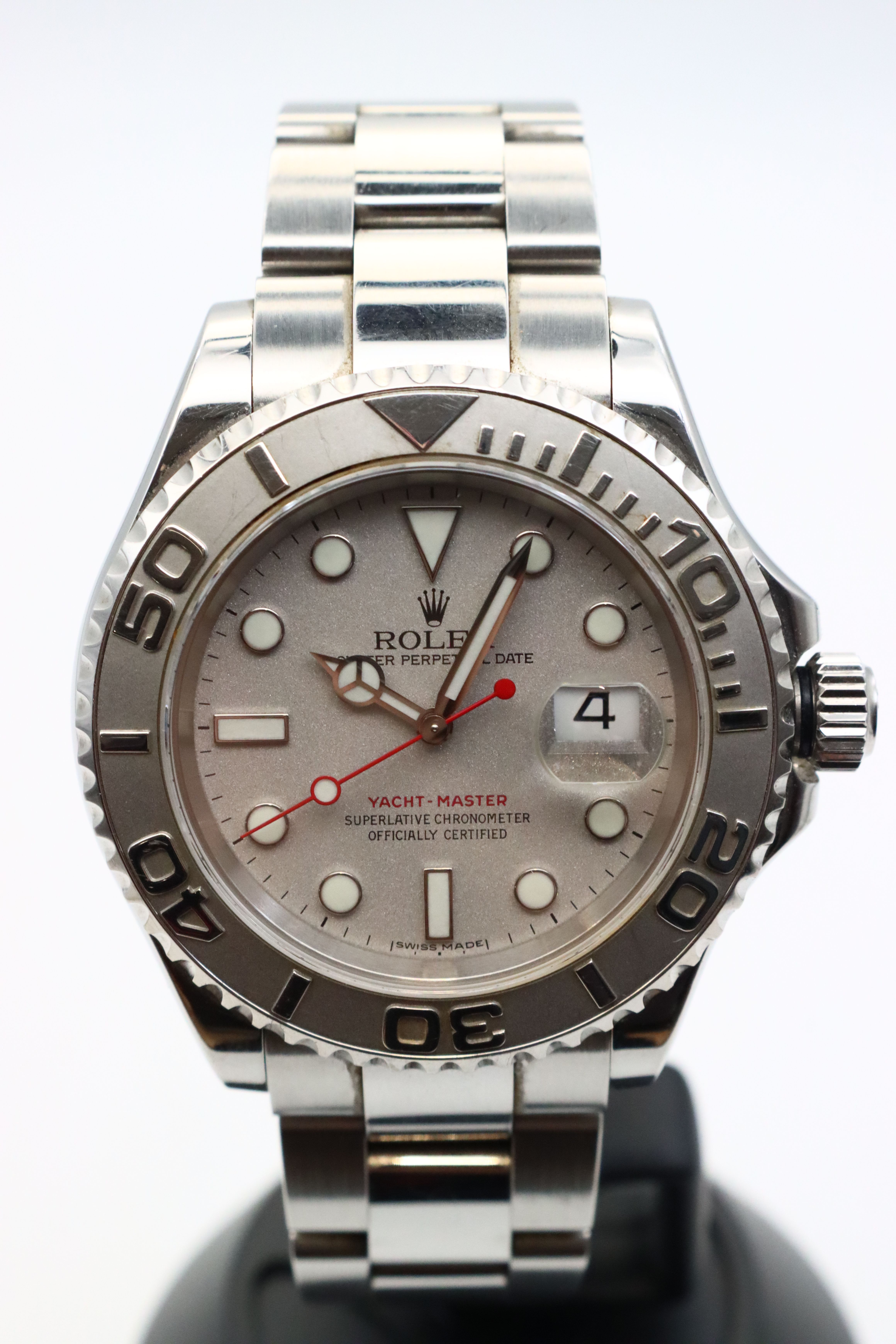 This Rolex Yacht-Master 116622 has a platinum dial and a bracelet strap. This Rolex has undergone a thorough inspection of water resistance, accuracy, functionality and condition to determine the level of reconditioning required to meet our strict standards. It has also been referenced against technical documents and manufacturer records where available to ensure authenticity and a clean history. All our watches have a 24-month warranty for your peace of mind. One of our skilled polishing technicians has removed marks on the case and bracelet of this watch, brought about by daily wear and tear, which is why this watch does not come with the remaining manufacturer’s warranty.